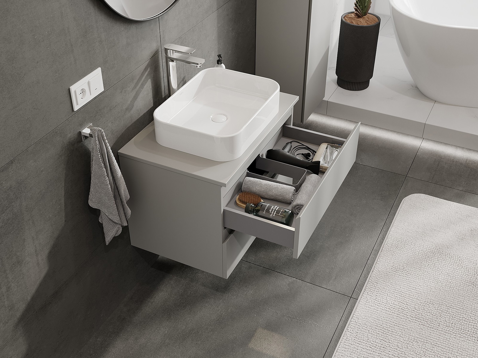 Onze modulaire badkamermeubels kunnen in verschillende kleurconfiguraties met elkaar worden gecombineerd, wat volledige personalisatie mogelijk maakt. Zowel het uiterlijk als de functies van de afzonderlijke elementen kunnen worden gekozen, waardoor de meubels kunnen worden aangepast aan persoonlijke stijlvoorkeuren en gebruikswensen.