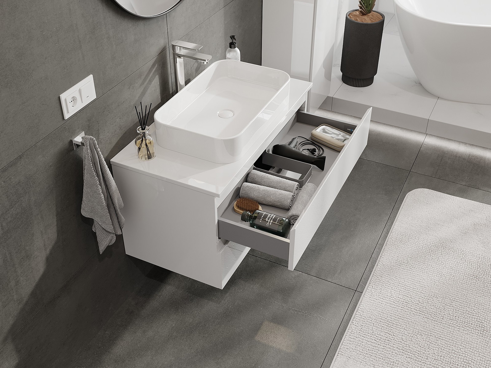 Onze modulaire badkamermeubels kunnen in verschillende kleurconfiguraties met elkaar worden gecombineerd, wat volledige personalisatie mogelijk maakt. Zowel het uiterlijk als de functies van de afzonderlijke elementen kunnen worden gekozen, waardoor de meubels kunnen worden aangepast aan persoonlijke stijlvoorkeuren en gebruikswensen.