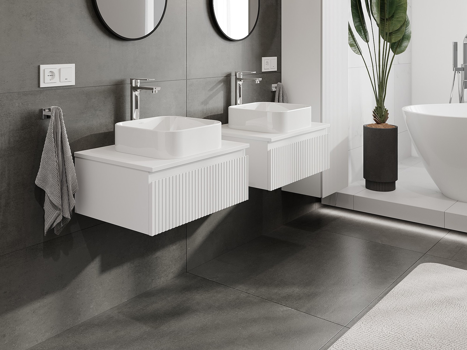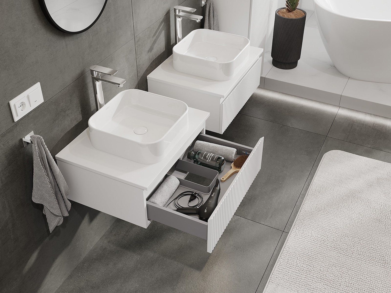Onze modulaire badkamermeubels kunnen in verschillende kleurconfiguraties met elkaar worden gecombineerd, wat volledige personalisatie mogelijk maakt. Zowel het uiterlijk als de functies van de afzonderlijke elementen kunnen worden gekozen, waardoor de meubels kunnen worden aangepast aan persoonlijke stijlvoorkeuren en gebruikswensen.