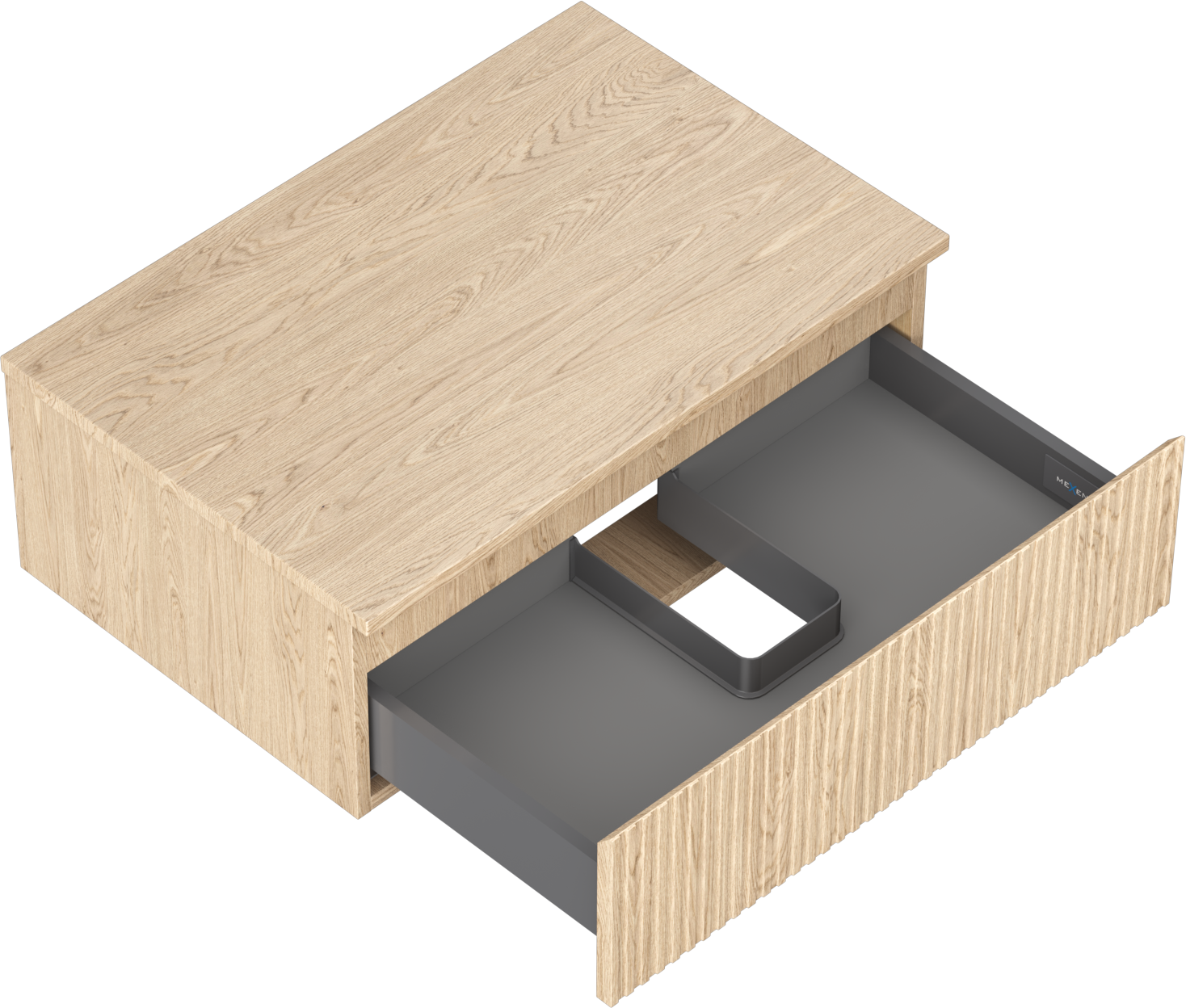 De uitsparing in de lade is zo ontworpen dat het de sifon kan bevatten, die noodzakelijk is in wastafelinstallaties. Hierdoor kan het meubel volledig functioneel worden gemonteerd, zonder dat er ruimte in de lade opgeofferd hoeft te worden voor installatiedoeleinden.