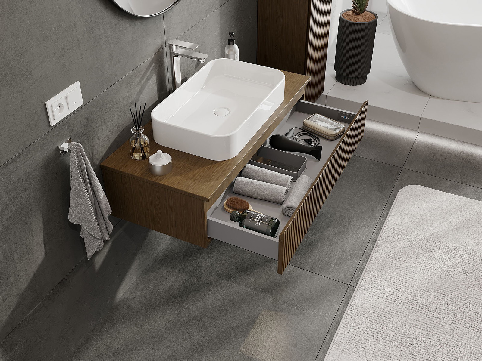 Mexen Rivel badkamerkastje onder de wastafel 100 cm met blad, 1 lade, gegroefd, walnoot - 91A20-10023-1-BFC86