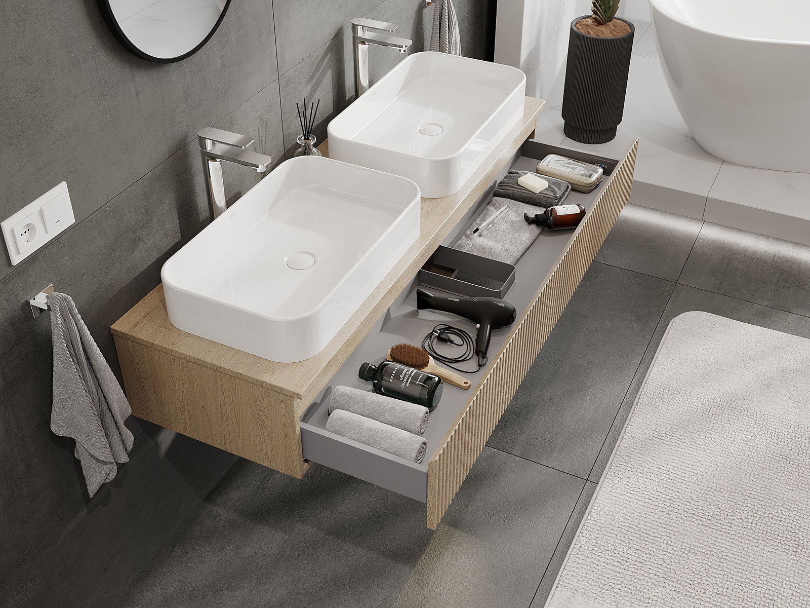 Onze modulaire badkamermeubels kunnen in verschillende kleurconfiguraties met elkaar worden gecombineerd, wat volledige personalisatie mogelijk maakt. Zowel het uiterlijk als de functies van de afzonderlijke elementen kunnen worden gekozen, waardoor de meubels kunnen worden aangepast aan persoonlijke stijlvoorkeuren en gebruikswensen.