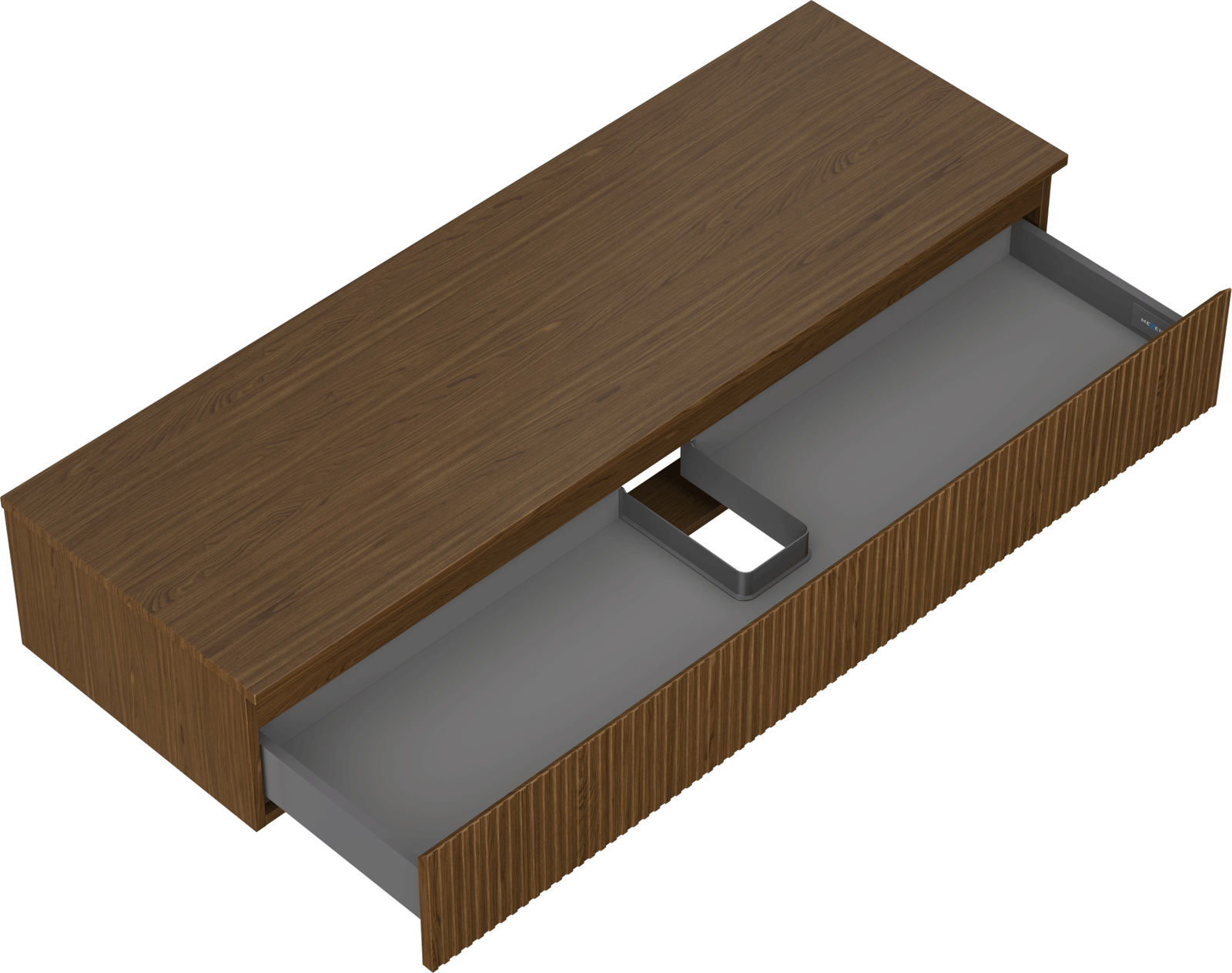 De uitsparing in de lade is zo ontworpen dat het de sifon kan bevatten, die noodzakelijk is in wastafelinstallaties. Hierdoor kan het meubel volledig functioneel worden gemonteerd, zonder dat er ruimte in de lade opgeofferd hoeft te worden voor installatiedoeleinden.