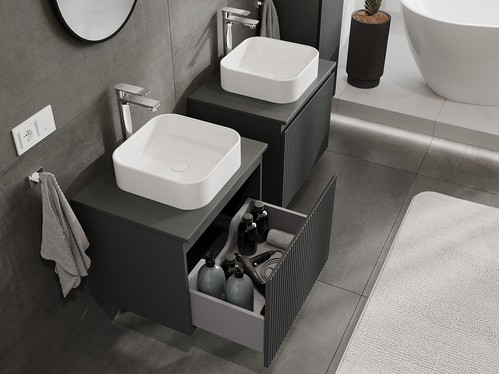 Onze modulaire badkamermeubels kunnen in verschillende kleurconfiguraties met elkaar worden gecombineerd, wat volledige personalisatie mogelijk maakt. Zowel het uiterlijk als de functies van de afzonderlijke elementen kunnen worden gekozen, waardoor de meubels kunnen worden aangepast aan persoonlijke stijlvoorkeuren en gebruikswensen.