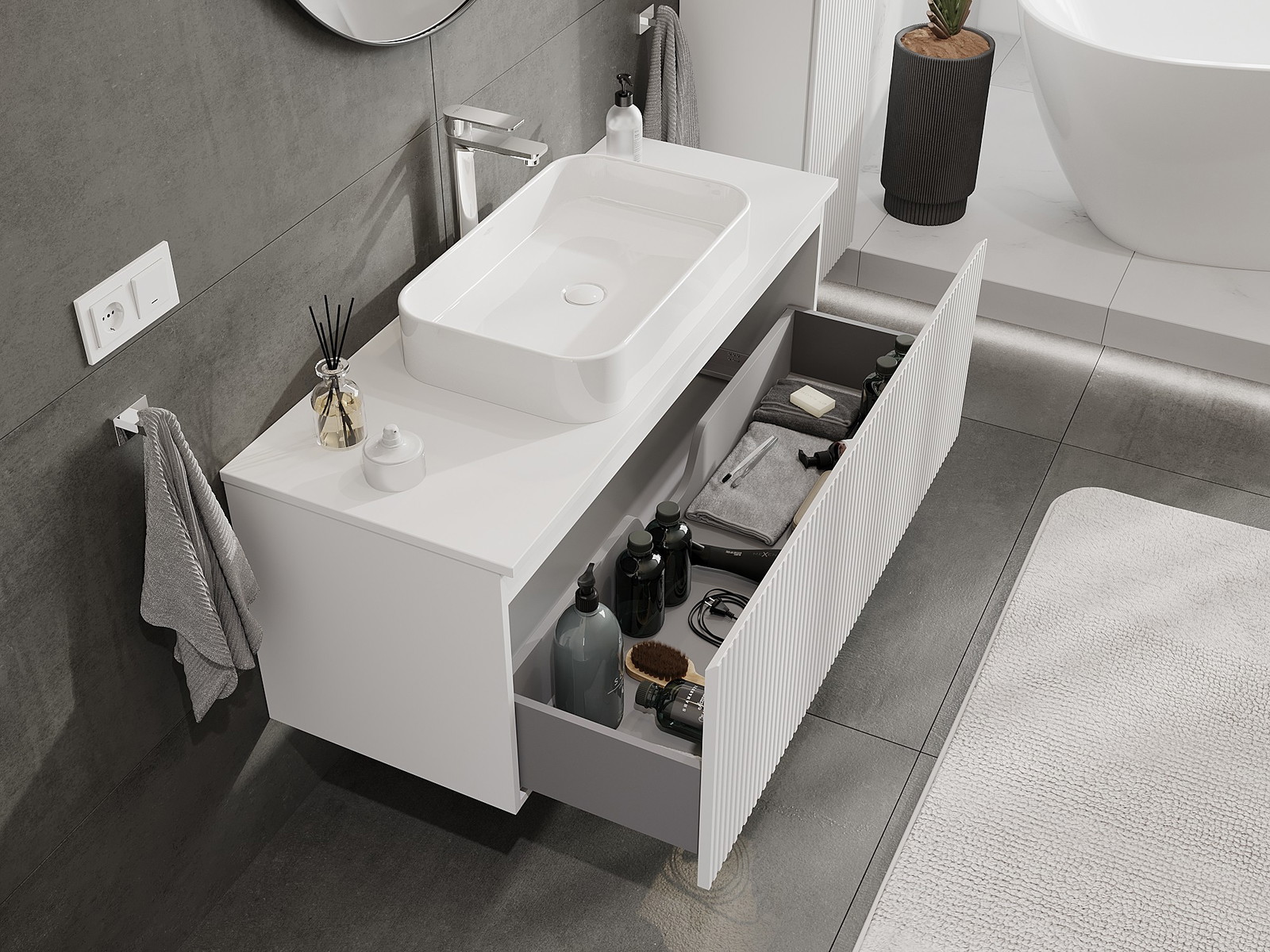 Onze modulaire badkamermeubels kunnen in verschillende kleurconfiguraties met elkaar worden gecombineerd, wat volledige personalisatie mogelijk maakt. Zowel het uiterlijk als de functies van de afzonderlijke elementen kunnen worden gekozen, waardoor de meubels kunnen worden aangepast aan persoonlijke stijlvoorkeuren en gebruikswensen.