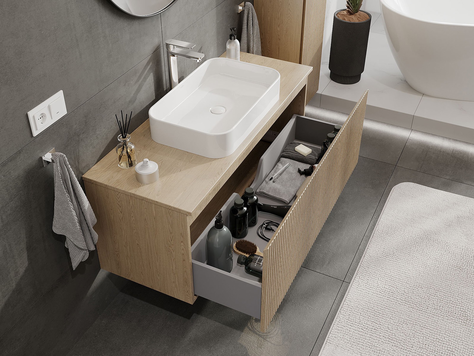 Onze modulaire badkamermeubels kunnen in verschillende kleurconfiguraties met elkaar worden gecombineerd, wat volledige personalisatie mogelijk maakt. Zowel het uiterlijk als de functies van de afzonderlijke elementen kunnen worden gekozen, waardoor de meubels kunnen worden aangepast aan persoonlijke stijlvoorkeuren en gebruikswensen.