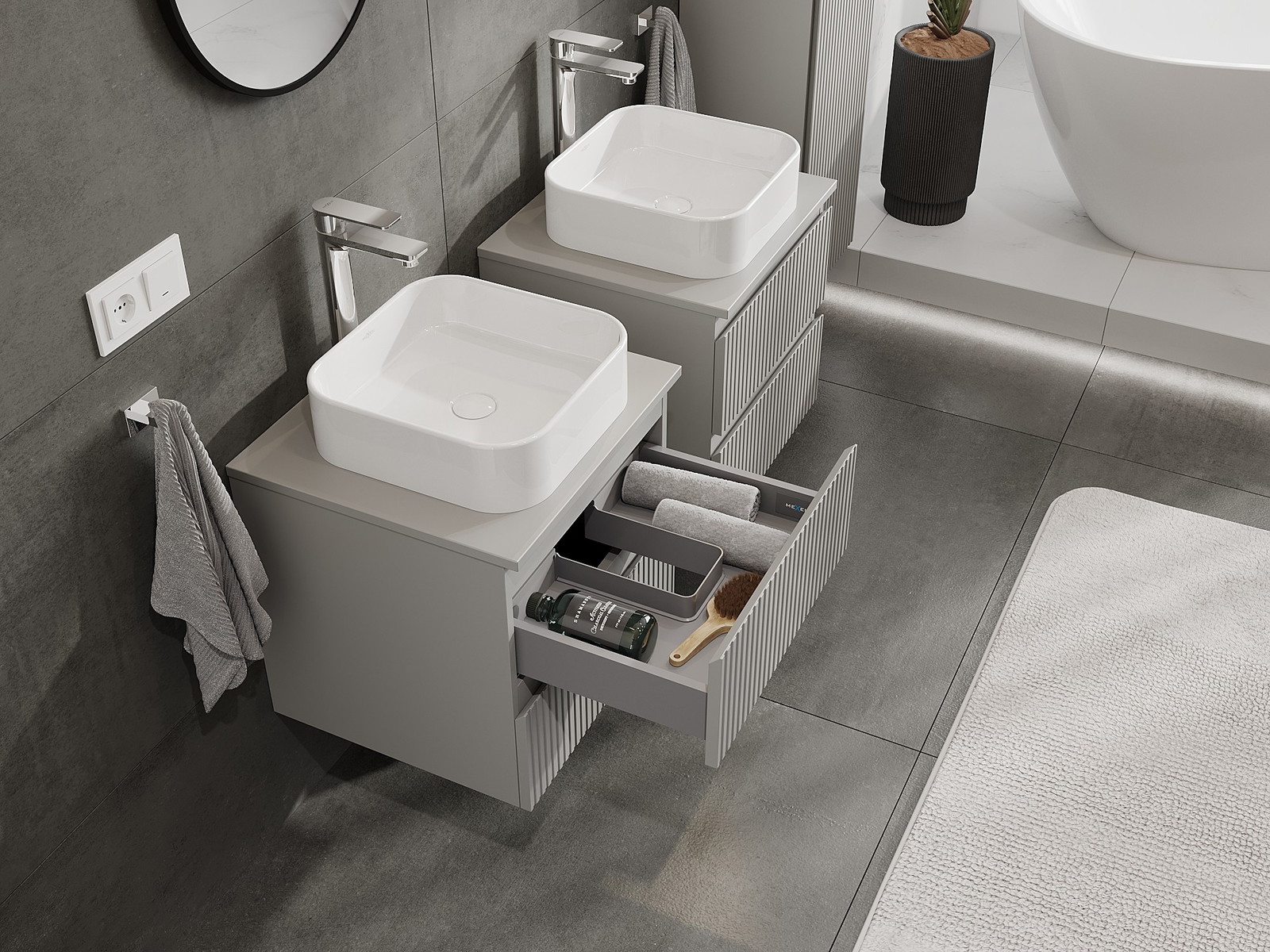 Onze modulaire badkamermeubels kunnen in verschillende kleurconfiguraties met elkaar worden gecombineerd, wat volledige personalisatie mogelijk maakt. Zowel het uiterlijk als de functies van de afzonderlijke elementen kunnen worden gekozen, waardoor de meubels kunnen worden aangepast aan persoonlijke stijlvoorkeuren en gebruikswensen.