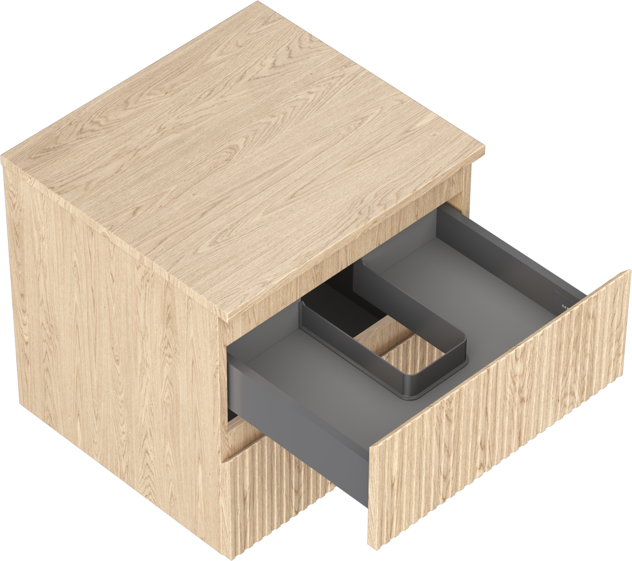De uitsparing in de lade is zo ontworpen dat het de sifon kan bevatten, die noodzakelijk is in wastafelinstallaties. Hierdoor kan het meubel volledig functioneel worden gemonteerd, zonder dat er ruimte in de lade opgeofferd hoeft te worden voor installatiedoeleinden.