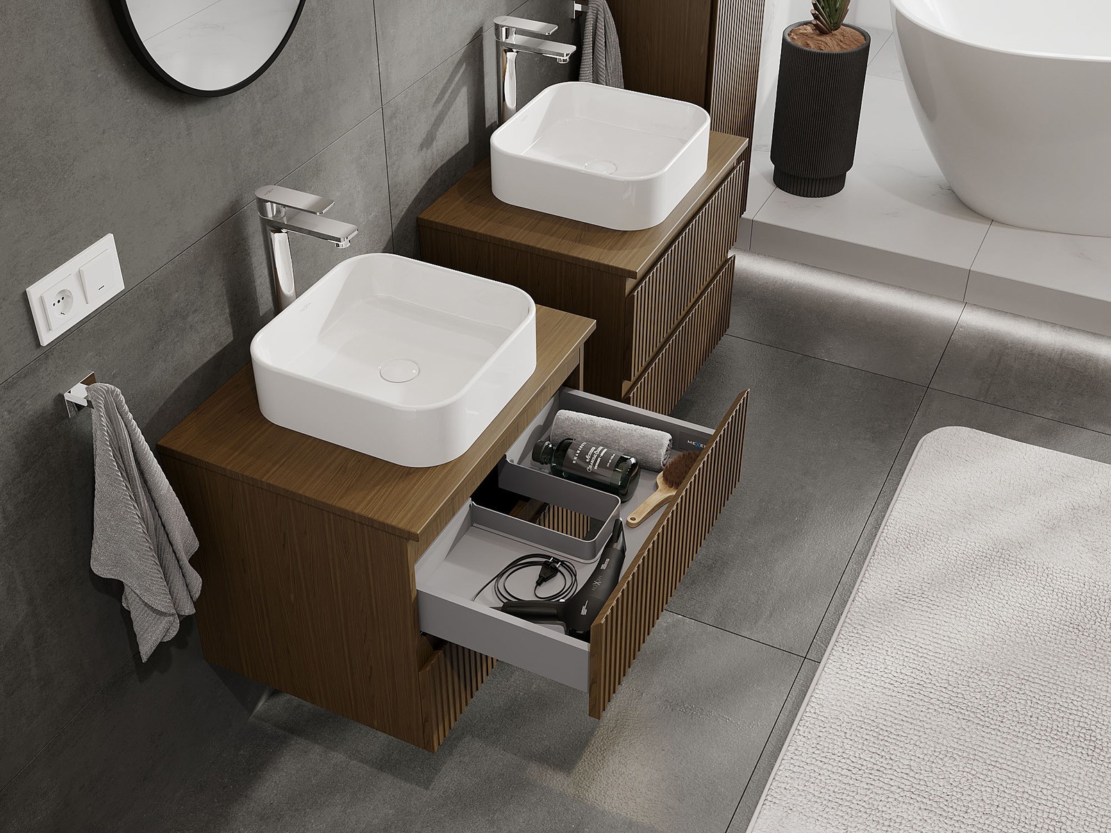 Onze modulaire badkamermeubels kunnen in verschillende kleurconfiguraties met elkaar worden gecombineerd, wat volledige personalisatie mogelijk maakt. Zowel het uiterlijk als de functies van de afzonderlijke elementen kunnen worden gekozen, waardoor de meubels kunnen worden aangepast aan persoonlijke stijlvoorkeuren en gebruikswensen.