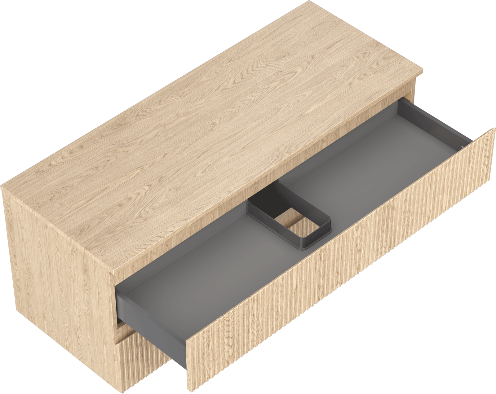 De uitsparing in de lade is zo ontworpen dat het de sifon kan bevatten, die noodzakelijk is in wastafelinstallaties. Hierdoor kan het meubel volledig functioneel worden gemonteerd, zonder dat er ruimte in de lade opgeofferd hoeft te worden voor installatiedoeleinden.