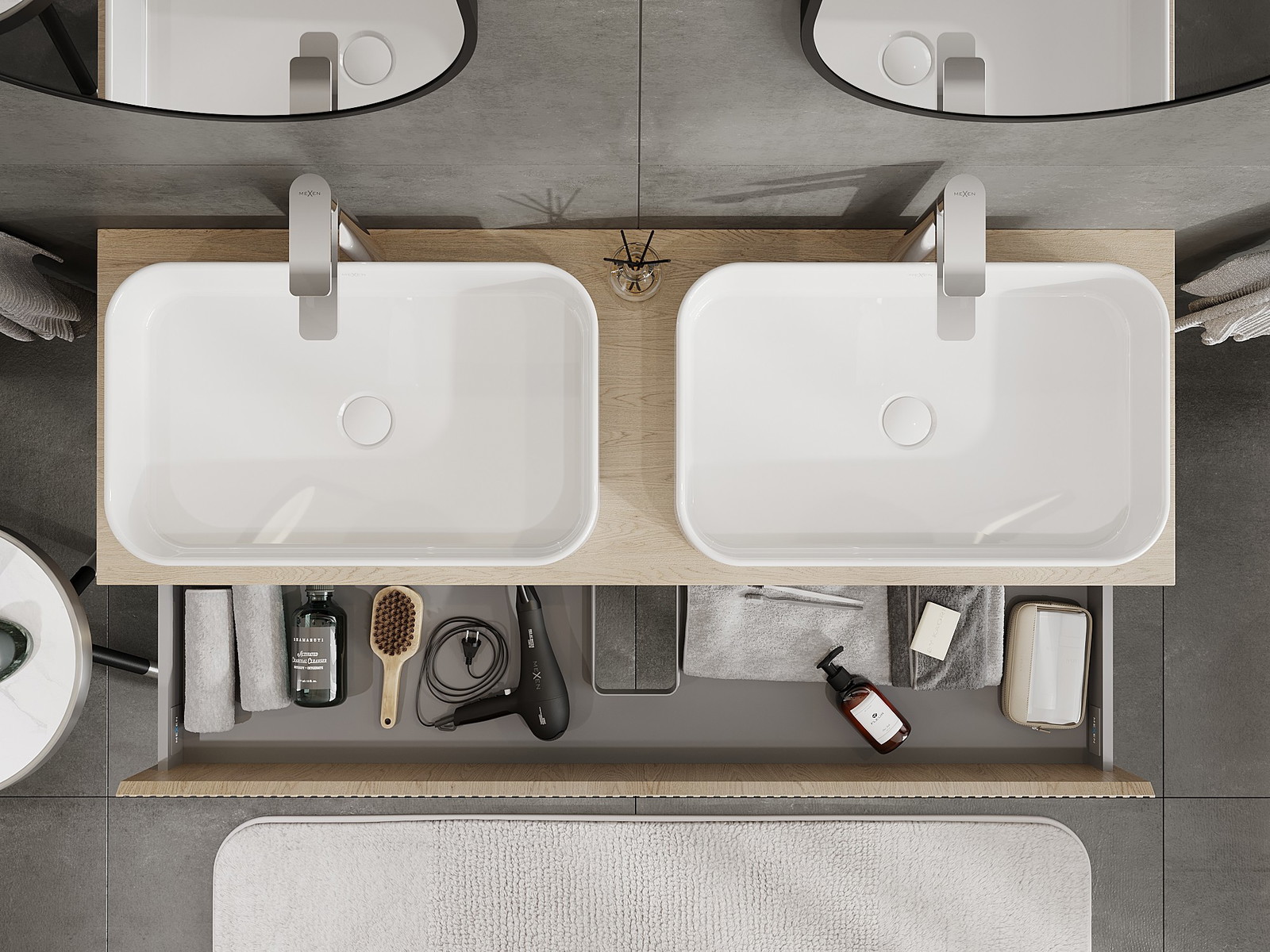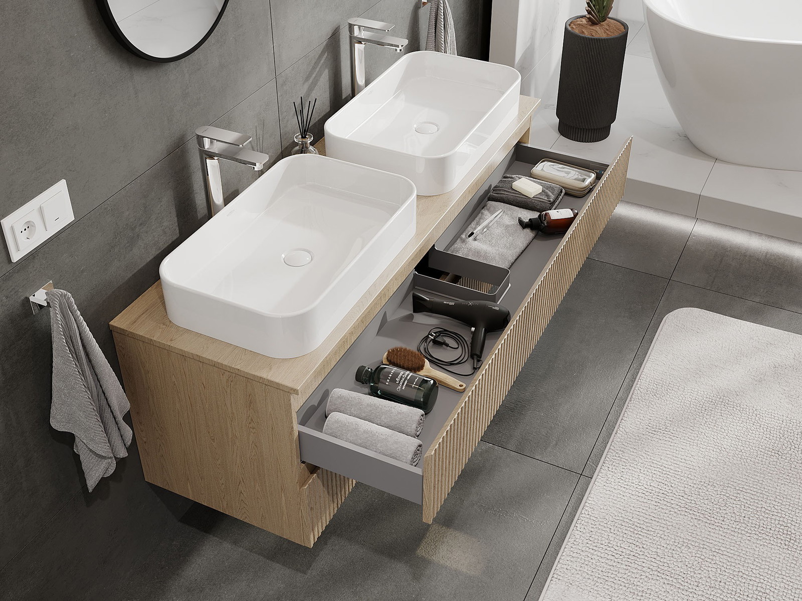 Onze modulaire badkamermeubels kunnen in verschillende kleurconfiguraties met elkaar worden gecombineerd, wat volledige personalisatie mogelijk maakt. Zowel het uiterlijk als de functies van de afzonderlijke elementen kunnen worden gekozen, waardoor de meubels kunnen worden aangepast aan persoonlijke stijlvoorkeuren en gebruikswensen.