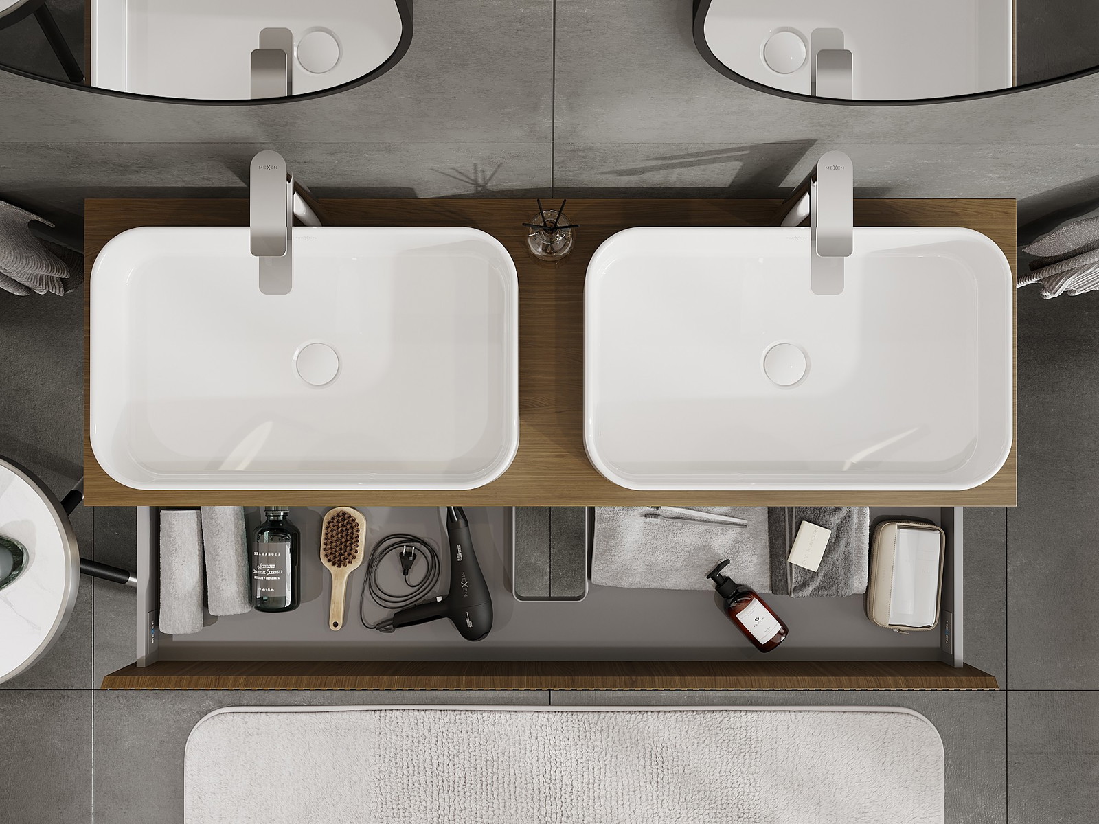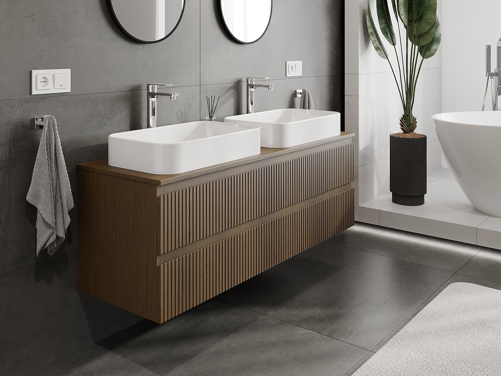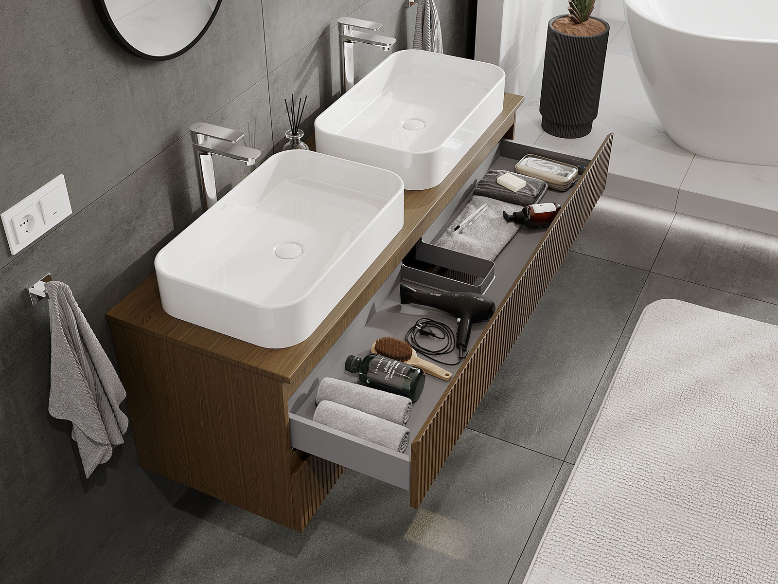 Onze modulaire badkamermeubels kunnen in verschillende kleurconfiguraties met elkaar worden gecombineerd, wat volledige personalisatie mogelijk maakt. Zowel het uiterlijk als de functies van de afzonderlijke elementen kunnen worden gekozen, waardoor de meubels kunnen worden aangepast aan persoonlijke stijlvoorkeuren en gebruikswensen.