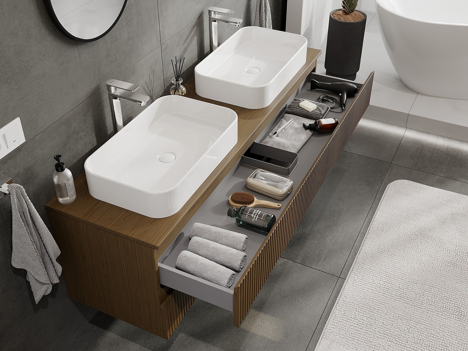 Onze modulaire badkamermeubels kunnen in verschillende kleurconfiguraties met elkaar worden gecombineerd, wat volledige personalisatie mogelijk maakt. Zowel het uiterlijk als de functies van de afzonderlijke elementen kunnen worden gekozen, waardoor de meubels kunnen worden aangepast aan persoonlijke stijlvoorkeuren en gebruikswensen.