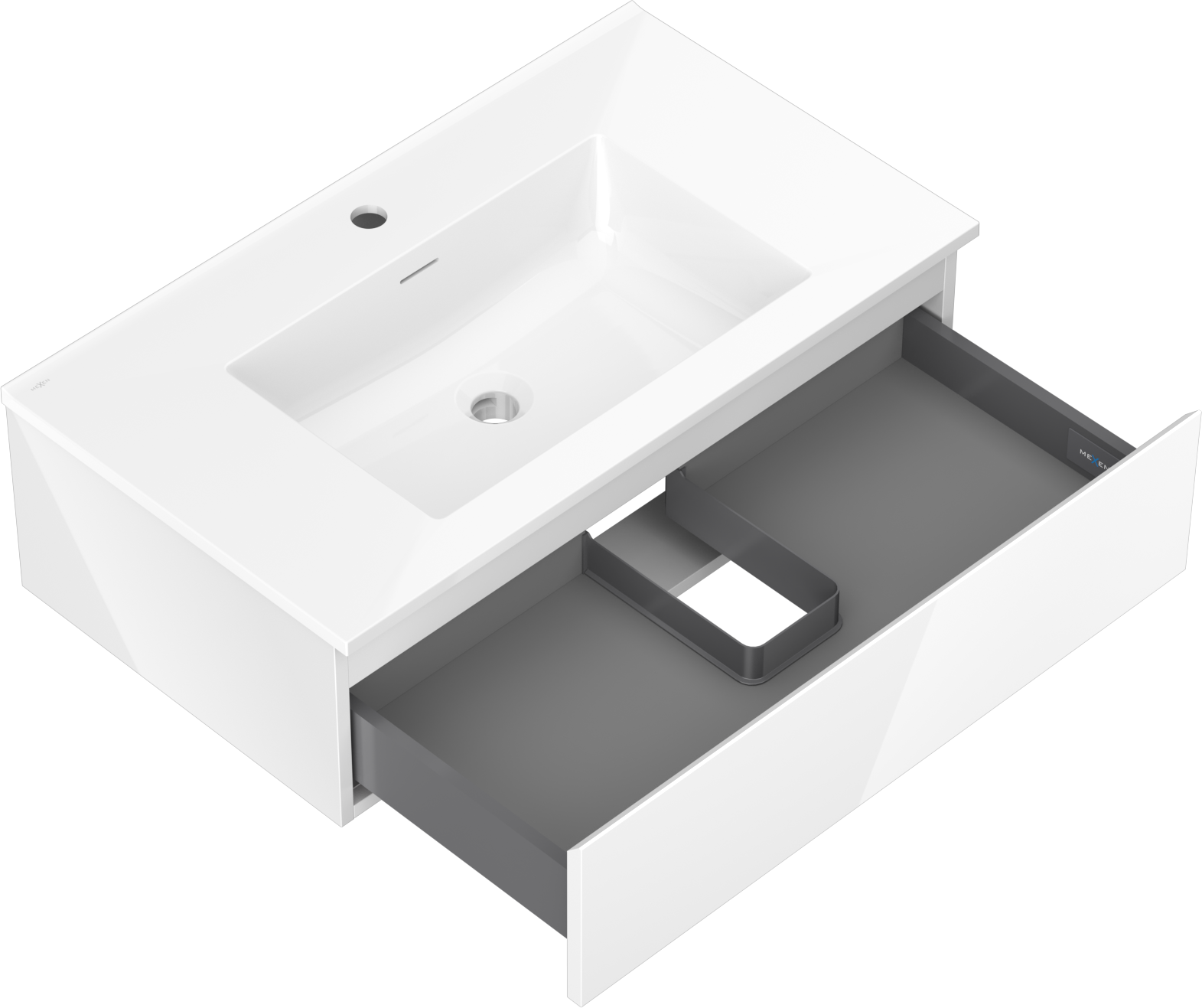 De uitsparing in de lade is zo ontworpen dat het de sifon kan bevatten, die noodzakelijk is in wastafelinstallaties. Hierdoor kan het meubel volledig functioneel worden gemonteerd, zonder dat er ruimte in de lade opgeofferd hoeft te worden voor installatiedoeleinden.