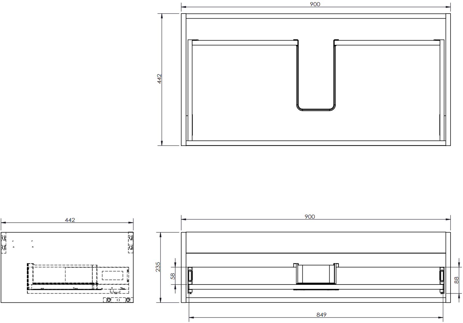De uitsparing in de lade is zo ontworpen dat het de sifon kan bevatten, die noodzakelijk is in wastafelinstallaties. Hierdoor kan het meubel volledig functioneel worden gemonteerd, zonder dat er ruimte in de lade opgeofferd hoeft te worden voor installatiedoeleinden.