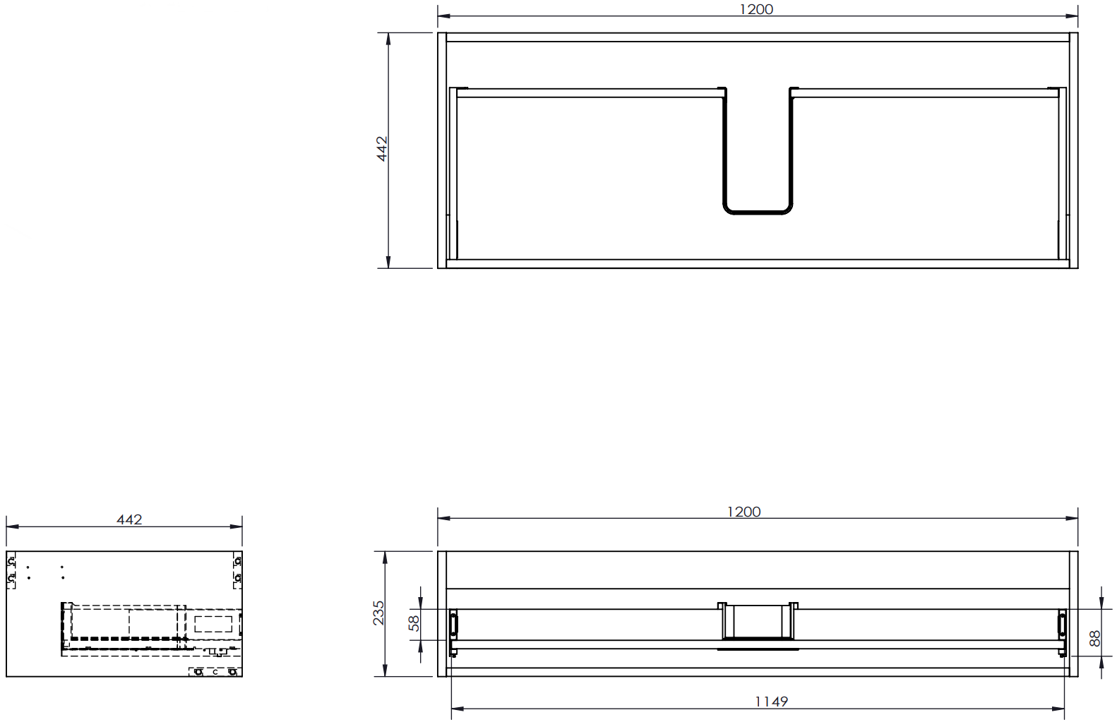 De uitsparing in de lade is zo ontworpen dat het de sifon kan bevatten, die noodzakelijk is in wastafelinstallaties. Hierdoor kan het meubel volledig functioneel worden gemonteerd, zonder dat er ruimte in de lade opgeofferd hoeft te worden voor installatiedoeleinden.