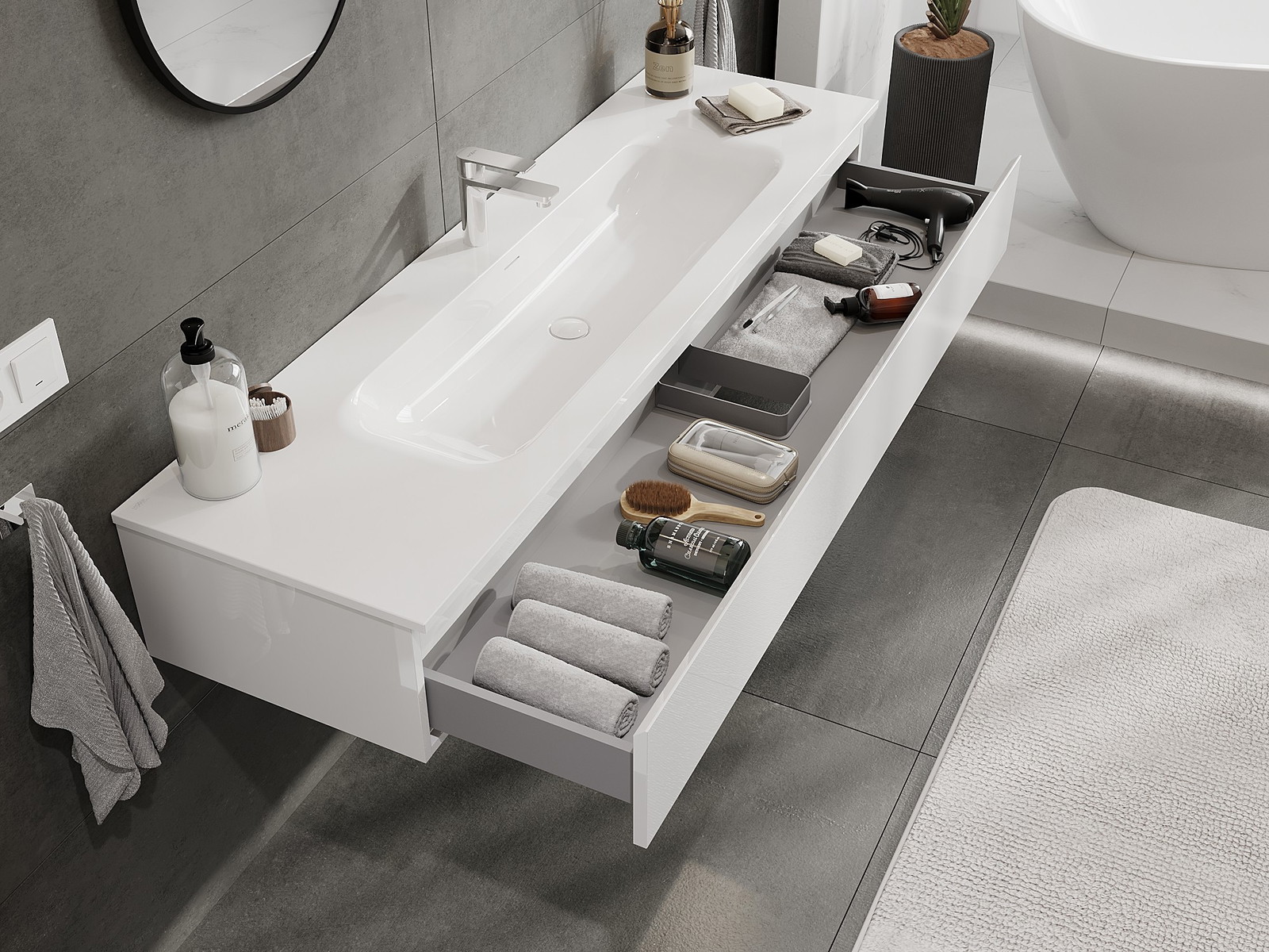 Onze modulaire badkamermeubels kunnen in verschillende kleurconfiguraties met elkaar worden gecombineerd, wat volledige personalisatie mogelijk maakt. Zowel het uiterlijk als de functies van de afzonderlijke elementen kunnen worden gekozen, waardoor de meubels kunnen worden aangepast aan persoonlijke stijlvoorkeuren en gebruikswensen.