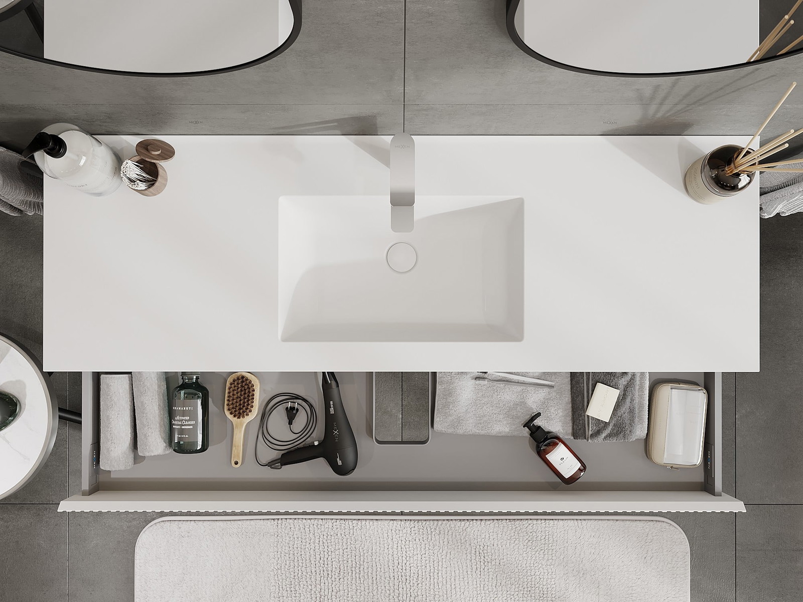 De uitsparing in de lade is zo ontworpen dat het de sifon kan bevatten, die noodzakelijk is in wastafelinstallaties. Hierdoor kan het meubel volledig functioneel worden gemonteerd, zonder dat er ruimte in de lade opgeofferd hoeft te worden voor installatiedoeleinden.
