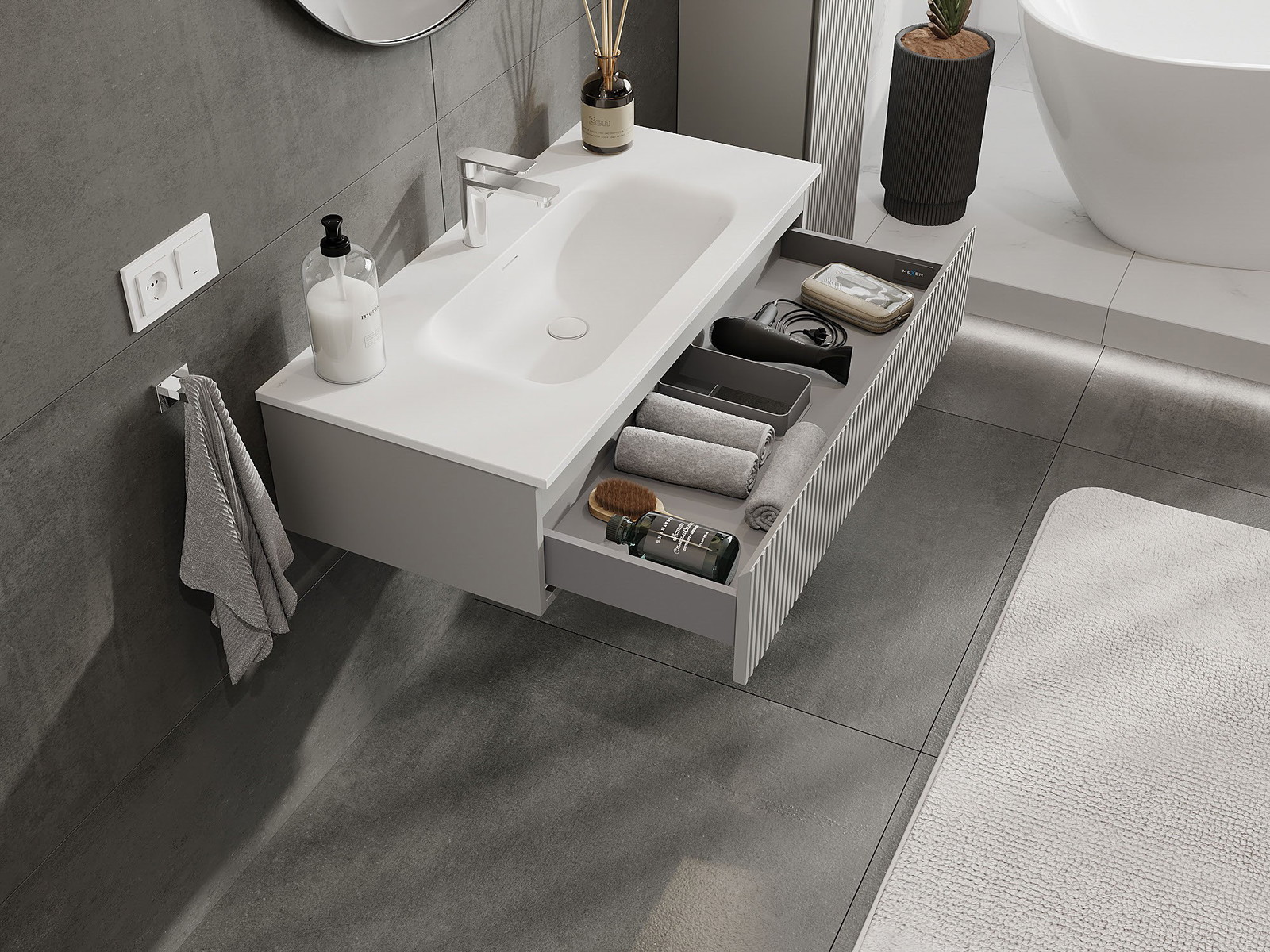 Mexen Rivel badkamerkast 100 cm met wastafel Vela, 1 lade, gefreesd, grijs mat/wit mat - 91A20-10023-1-BF62-W23M01
