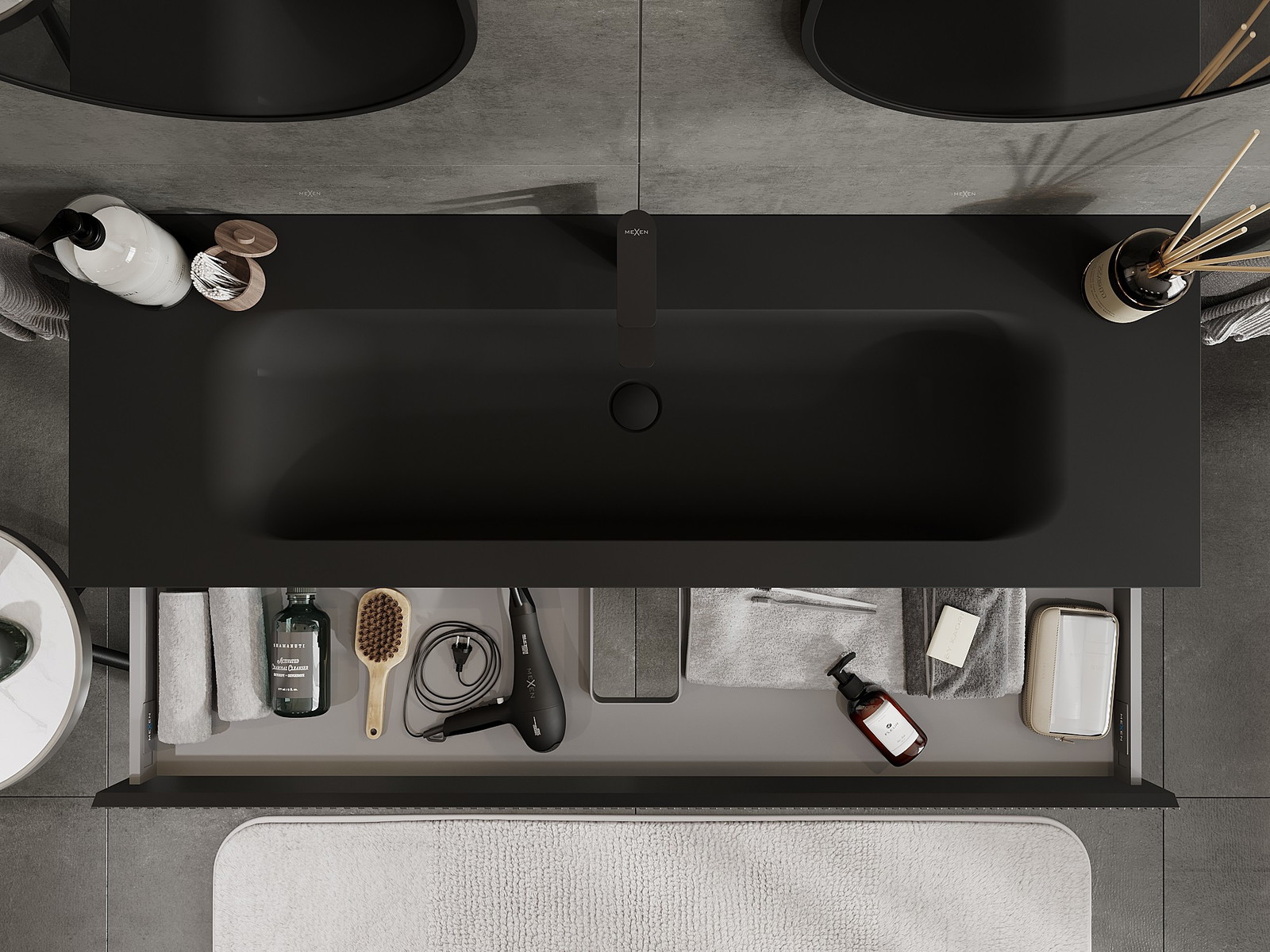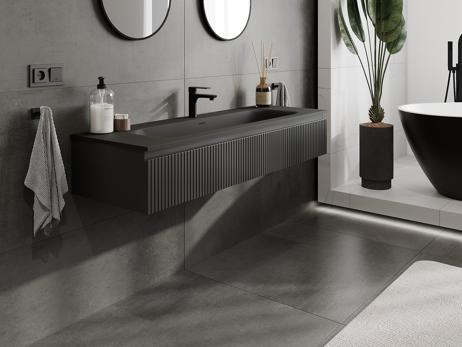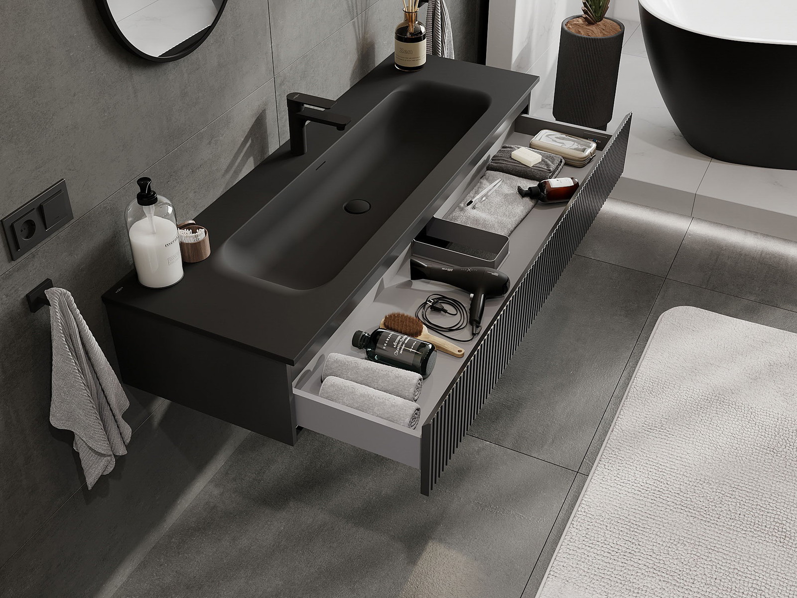 Mexen Rivel badkamerkast 140 cm met wastafel Vela, 1 lade, geribbeld, zwart mat - 91A20-14023-1-BF71-W23M71