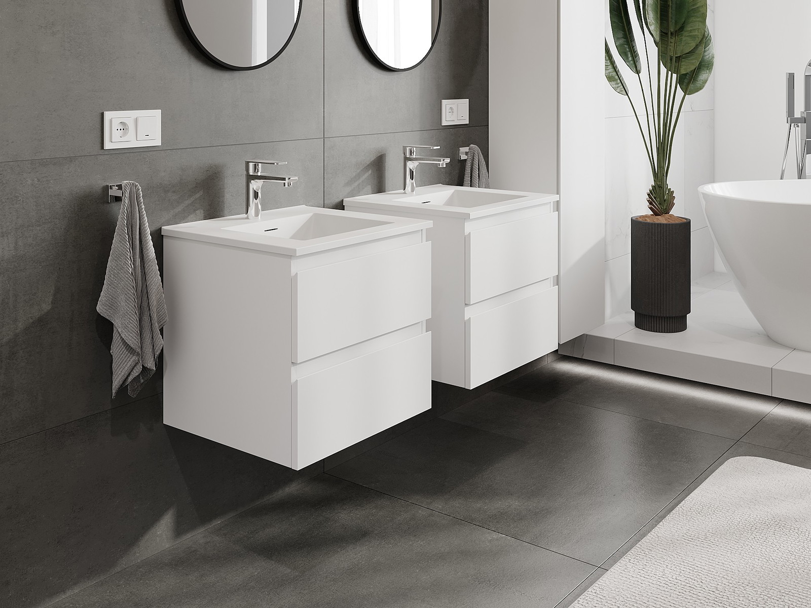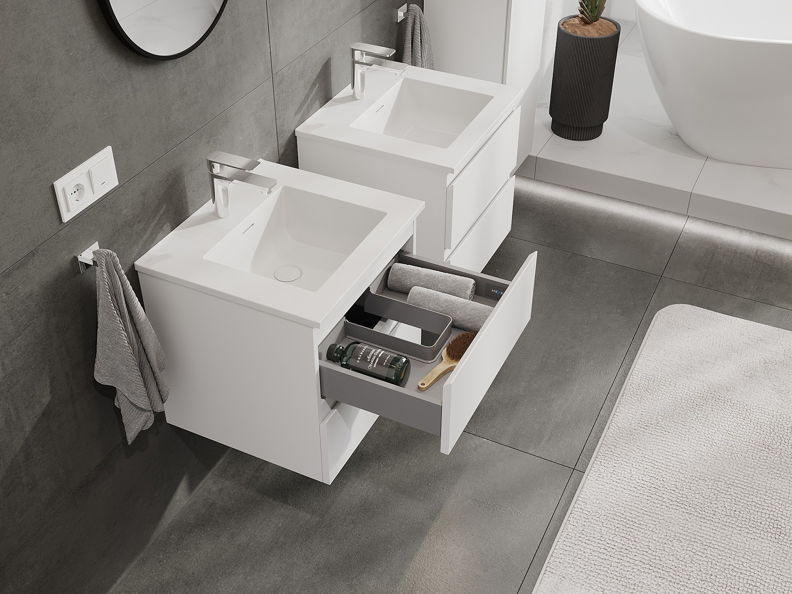 Onze modulaire badkamermeubels kunnen in verschillende kleurconfiguraties met elkaar worden gecombineerd, wat volledige personalisatie mogelijk maakt. Zowel het uiterlijk als de functies van de afzonderlijke elementen kunnen worden gekozen, waardoor de meubels kunnen worden aangepast aan persoonlijke stijlvoorkeuren en gebruikswensen.