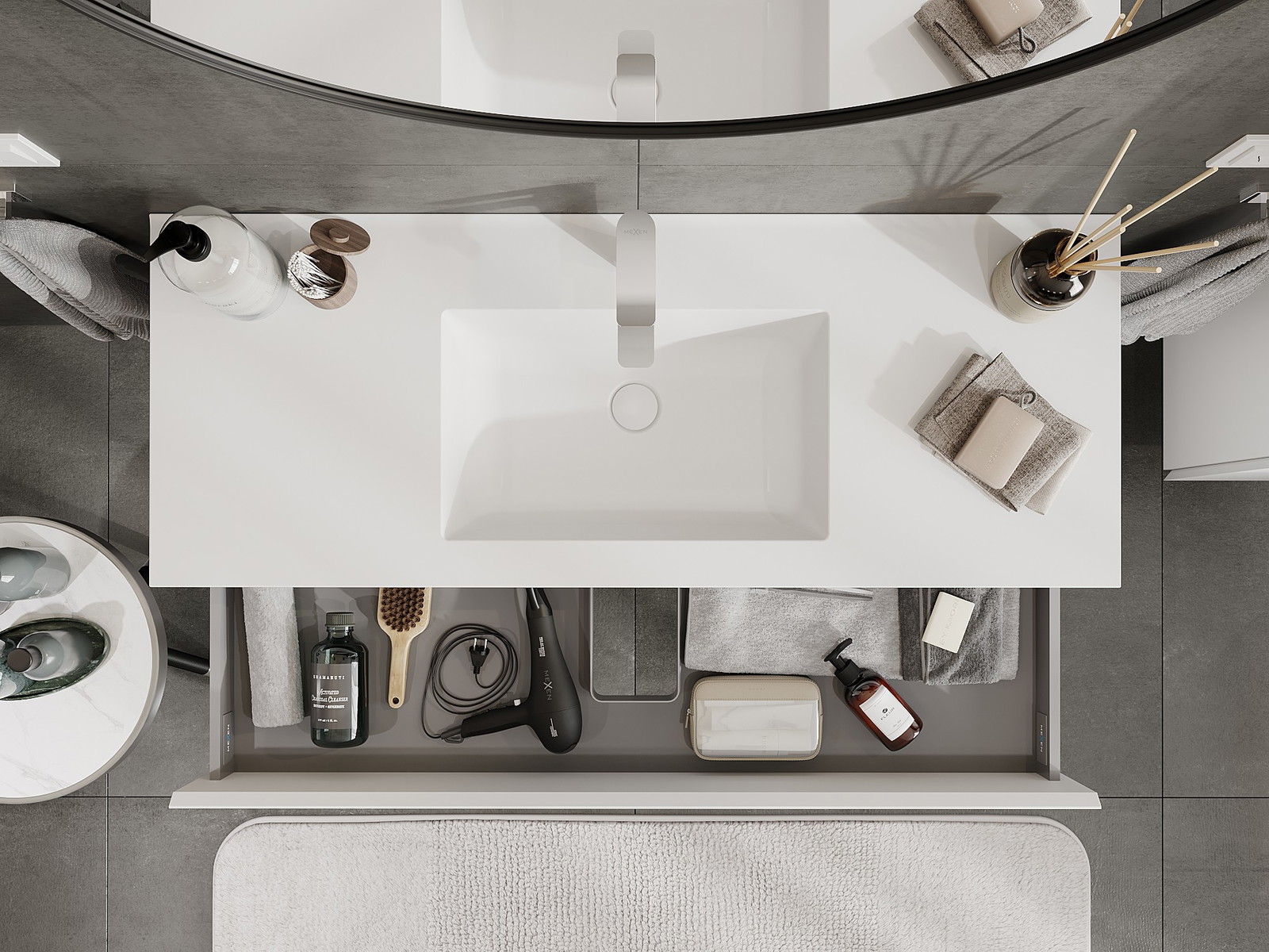 De uitsparing in de lade is zo ontworpen dat het de sifon kan bevatten, die noodzakelijk is in wastafelinstallaties. Hierdoor kan het meubel volledig functioneel worden gemonteerd, zonder dat er ruimte in de lade opgeofferd hoeft te worden voor installatiedoeleinden.