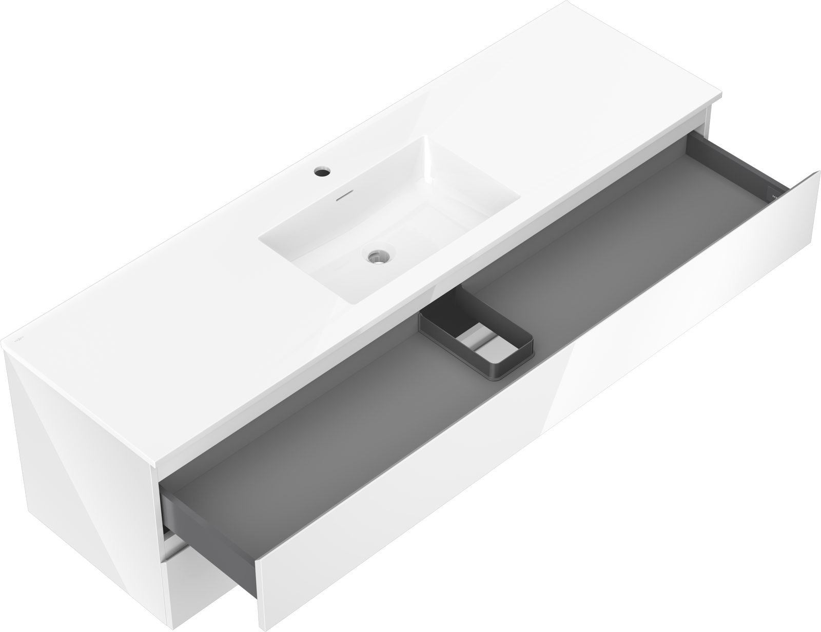 De uitsparing in de lade is zo ontworpen dat het de sifon kan bevatten, die noodzakelijk is in wastafelinstallaties. Hierdoor kan het meubel volledig functioneel worden gemonteerd, zonder dat er ruimte in de lade opgeofferd hoeft te worden voor installatiedoeleinden.