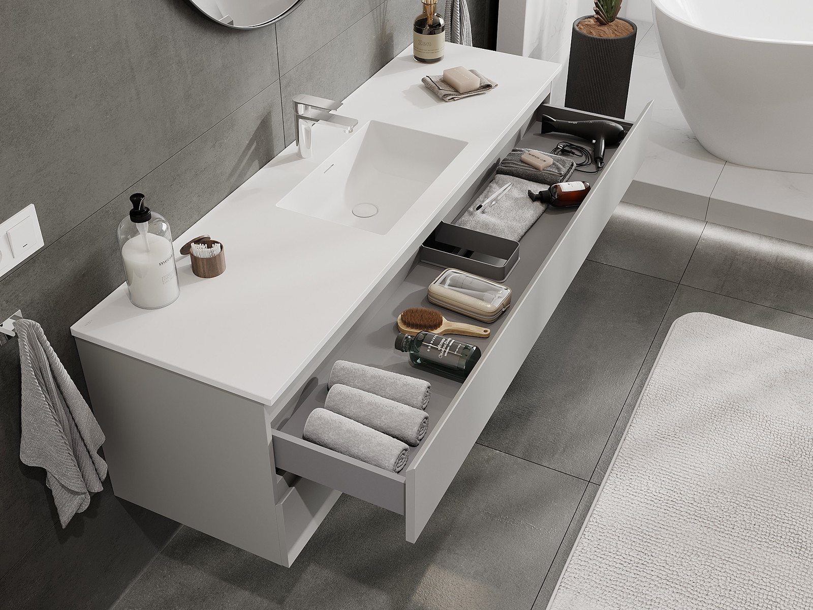 Onze modulaire badkamermeubels kunnen in verschillende kleurconfiguraties met elkaar worden gecombineerd, wat volledige personalisatie mogelijk maakt. Zowel het uiterlijk als de functies van de afzonderlijke elementen kunnen worden gekozen, waardoor de meubels kunnen worden aangepast aan persoonlijke stijlvoorkeuren en gebruikswensen.