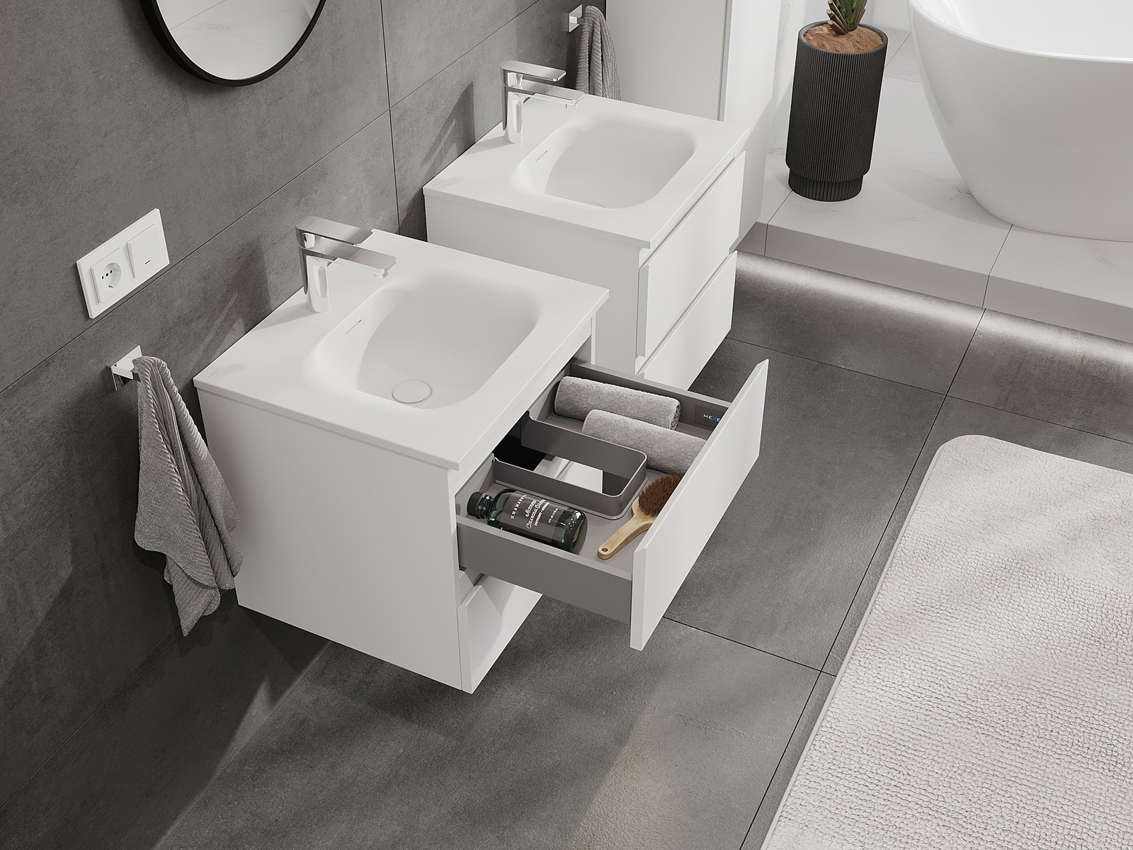Onze modulaire badkamermeubels kunnen in verschillende kleurconfiguraties met elkaar worden gecombineerd, wat volledige personalisatie mogelijk maakt. Zowel het uiterlijk als de functies van de afzonderlijke elementen kunnen worden gekozen, waardoor de meubels kunnen worden aangepast aan persoonlijke stijlvoorkeuren en gebruikswensen.
