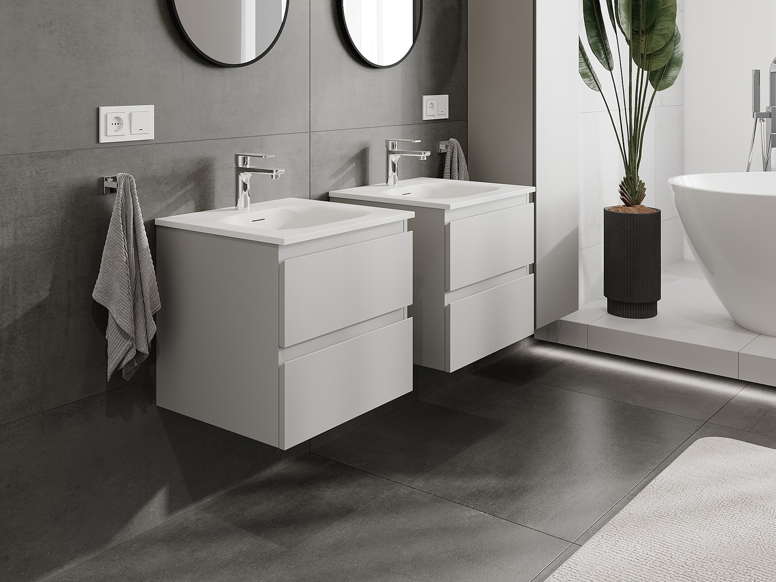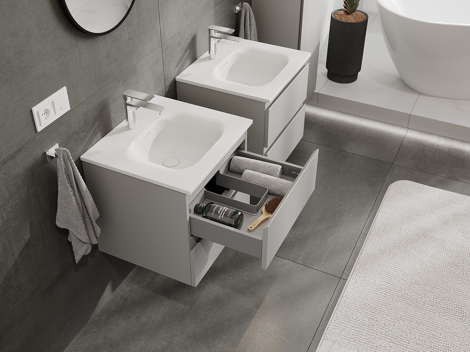 Onze modulaire badkamermeubels kunnen in verschillende kleurconfiguraties met elkaar worden gecombineerd, wat volledige personalisatie mogelijk maakt. Zowel het uiterlijk als de functies van de afzonderlijke elementen kunnen worden gekozen, waardoor de meubels kunnen worden aangepast aan persoonlijke stijlvoorkeuren en gebruikswensen.