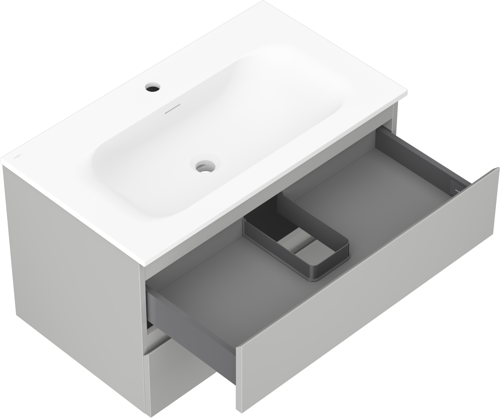 De uitsparing in de lade is zo ontworpen dat het de sifon kan bevatten, die noodzakelijk is in wastafelinstallaties. Hierdoor kan het meubel volledig functioneel worden gemonteerd, zonder dat er ruimte in de lade opgeofferd hoeft te worden voor installatiedoeleinden.