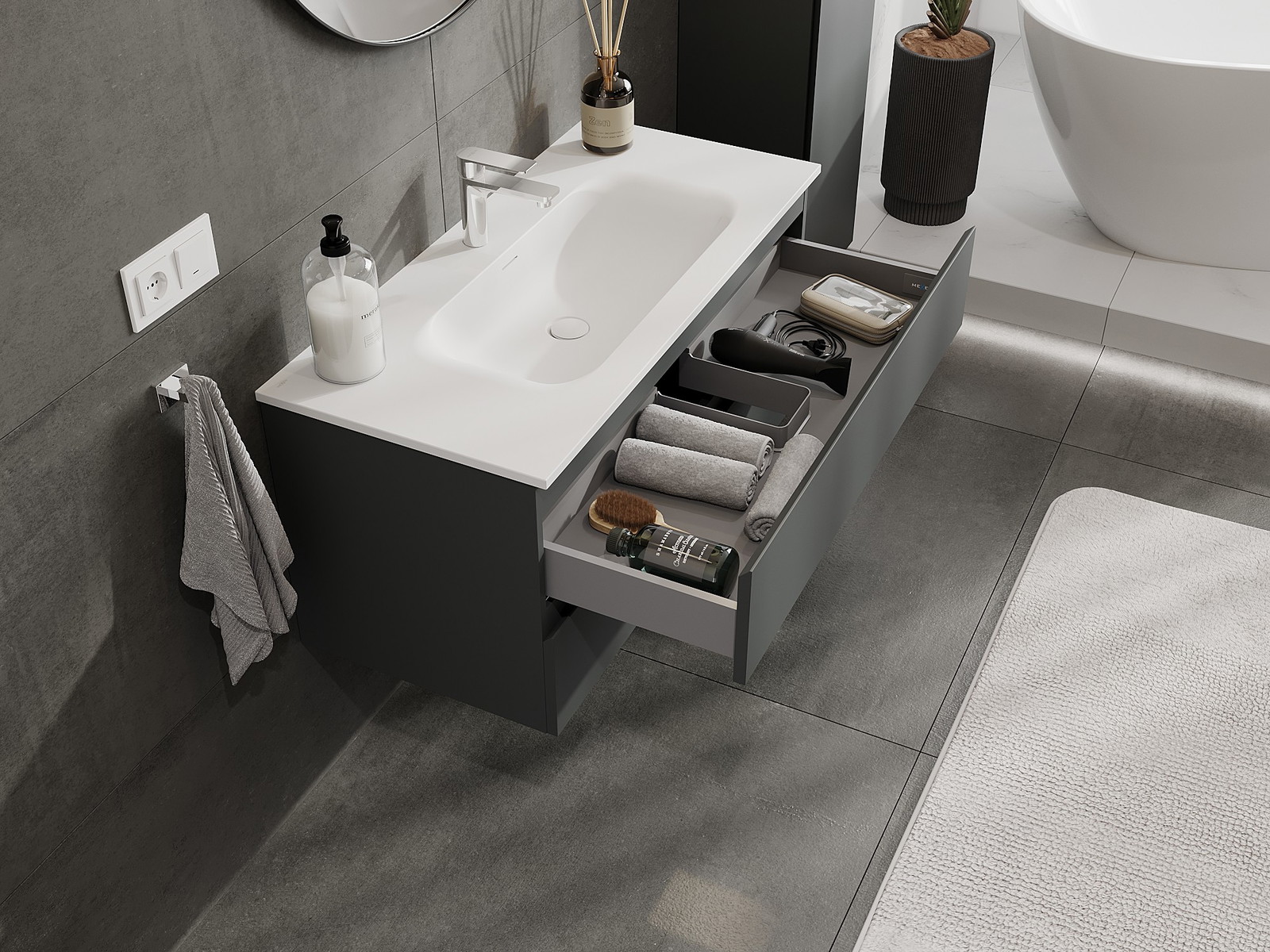 Onze modulaire badkamermeubels kunnen in verschillende kleurconfiguraties met elkaar worden gecombineerd, wat volledige personalisatie mogelijk maakt. Zowel het uiterlijk als de functies van de afzonderlijke elementen kunnen worden gekozen, waardoor de meubels kunnen worden aangepast aan persoonlijke stijlvoorkeuren en gebruikswensen.