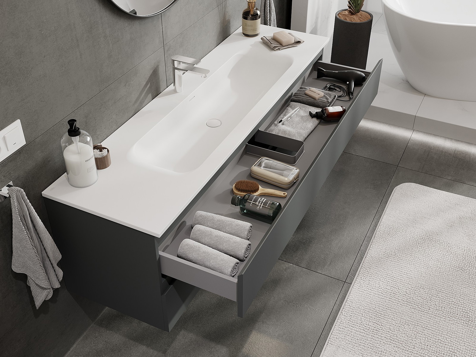 Onze modulaire badkamermeubels kunnen in verschillende kleurconfiguraties met elkaar worden gecombineerd, wat volledige personalisatie mogelijk maakt. Zowel het uiterlijk als de functies van de afzonderlijke elementen kunnen worden gekozen, waardoor de meubels kunnen worden aangepast aan persoonlijke stijlvoorkeuren en gebruikswensen.