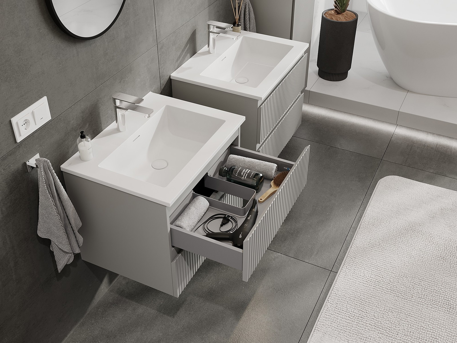 Onze modulaire badkamermeubels kunnen in verschillende kleurconfiguraties met elkaar worden gecombineerd, wat volledige personalisatie mogelijk maakt. Zowel het uiterlijk als de functies van de afzonderlijke elementen kunnen worden gekozen, waardoor de meubels kunnen worden aangepast aan persoonlijke stijlvoorkeuren en gebruikswensen.