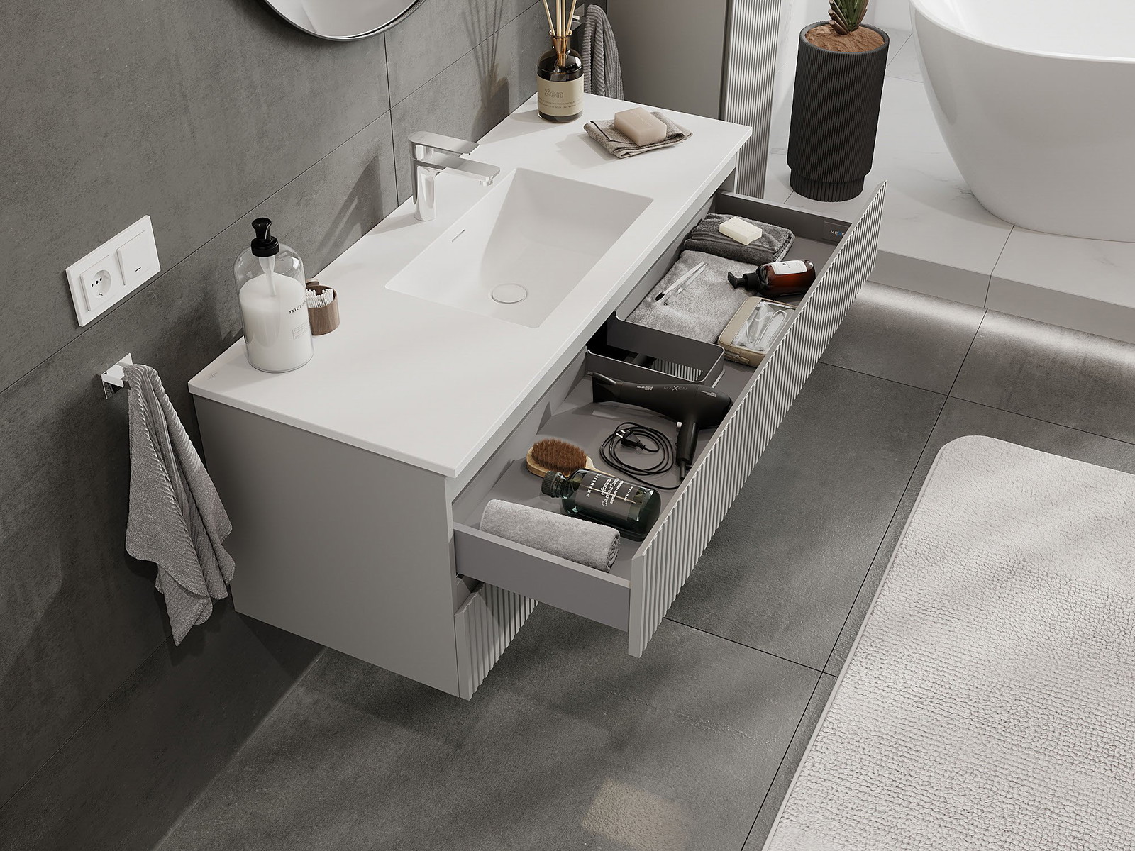 Onze modulaire badkamermeubels kunnen in verschillende kleurconfiguraties met elkaar worden gecombineerd, wat volledige personalisatie mogelijk maakt. Zowel het uiterlijk als de functies van de afzonderlijke elementen kunnen worden gekozen, waardoor de meubels kunnen worden aangepast aan persoonlijke stijlvoorkeuren en gebruikswensen.