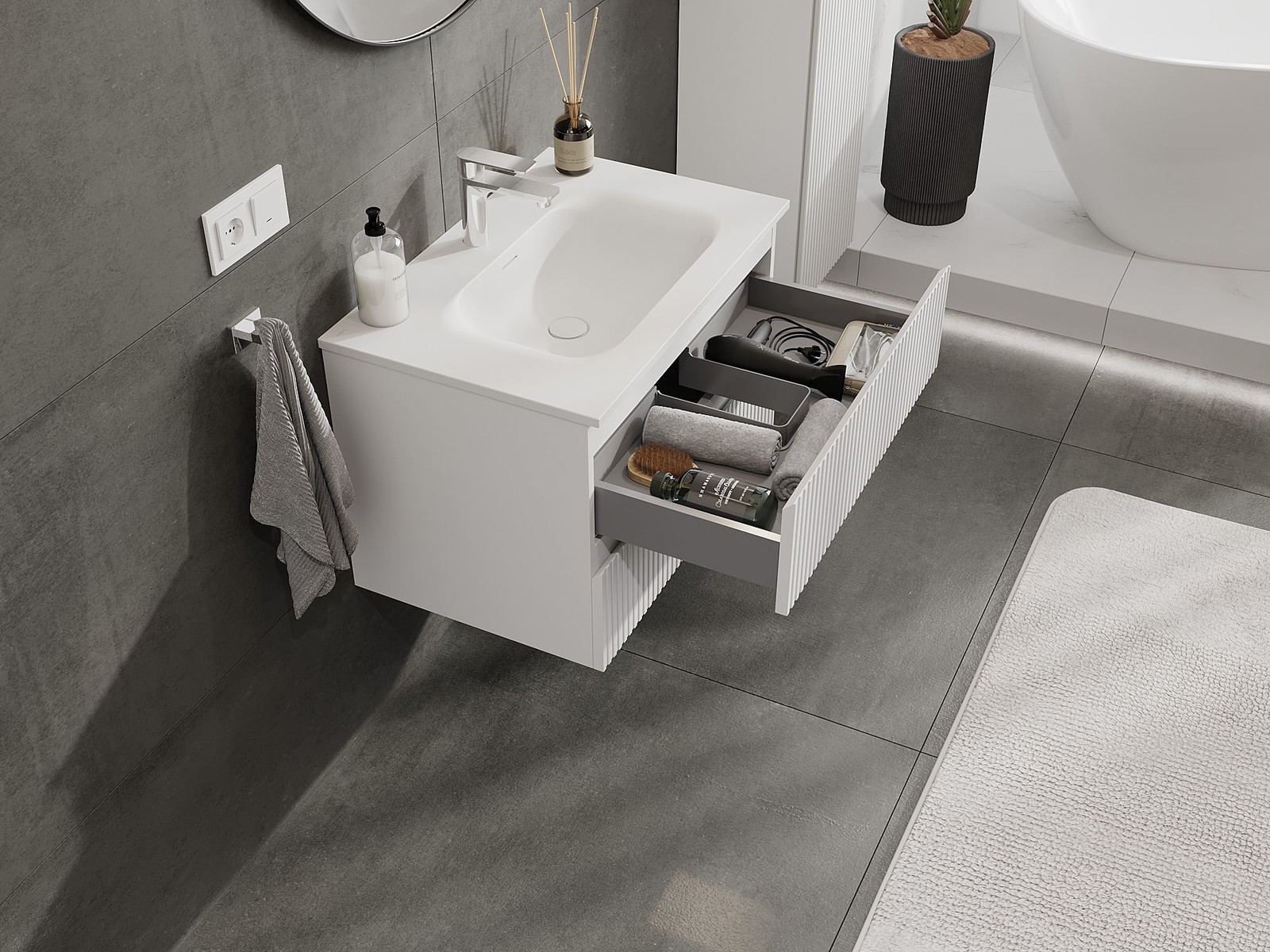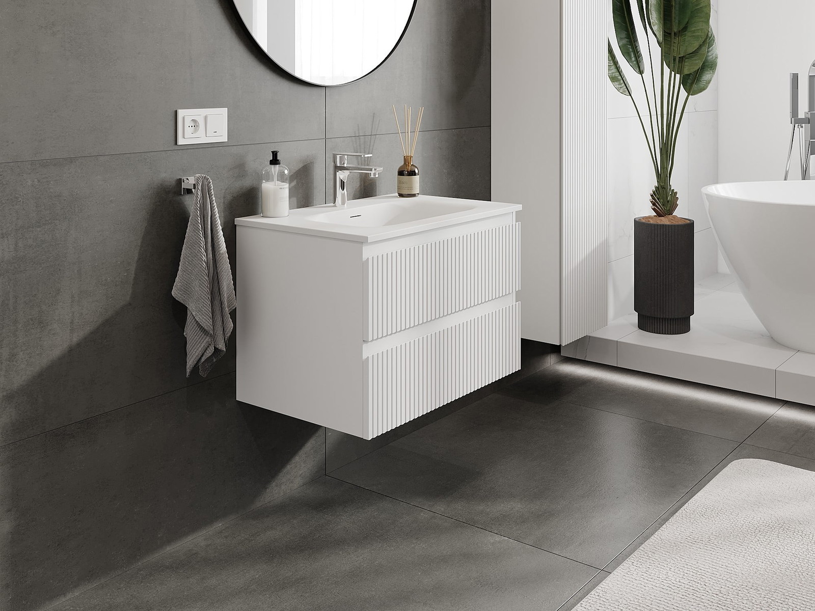 Onze modulaire badkamermeubels kunnen in verschillende kleurconfiguraties met elkaar worden gecombineerd, wat volledige personalisatie mogelijk maakt. Zowel het uiterlijk als de functies van de afzonderlijke elementen kunnen worden gekozen, waardoor de meubels kunnen worden aangepast aan persoonlijke stijlvoorkeuren en gebruikswensen.