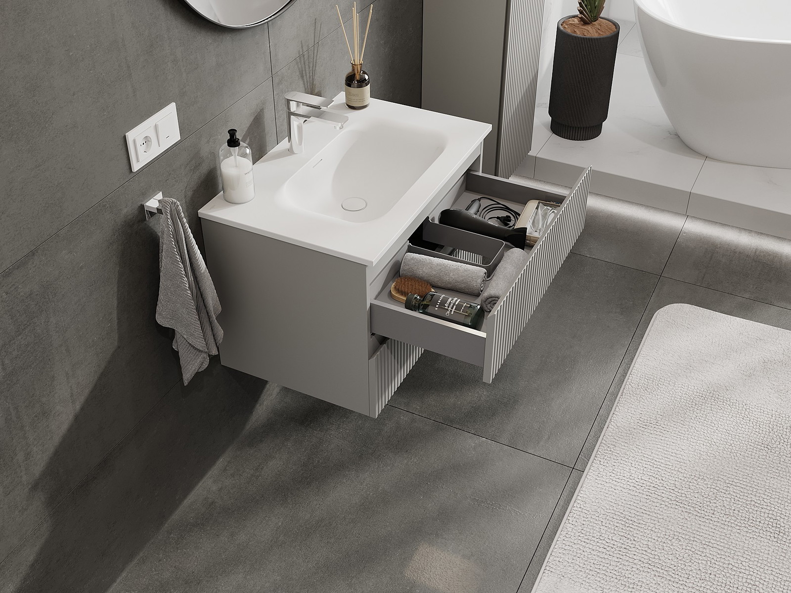 Onze modulaire badkamermeubels kunnen in verschillende kleurconfiguraties met elkaar worden gecombineerd, wat volledige personalisatie mogelijk maakt. Zowel het uiterlijk als de functies van de afzonderlijke elementen kunnen worden gekozen, waardoor de meubels kunnen worden aangepast aan persoonlijke stijlvoorkeuren en gebruikswensen.