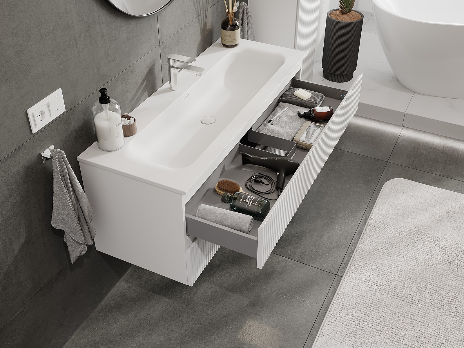 Onze modulaire badkamermeubels kunnen in verschillende kleurconfiguraties met elkaar worden gecombineerd, wat volledige personalisatie mogelijk maakt. Zowel het uiterlijk als de functies van de afzonderlijke elementen kunnen worden gekozen, waardoor de meubels kunnen worden aangepast aan persoonlijke stijlvoorkeuren en gebruikswensen.