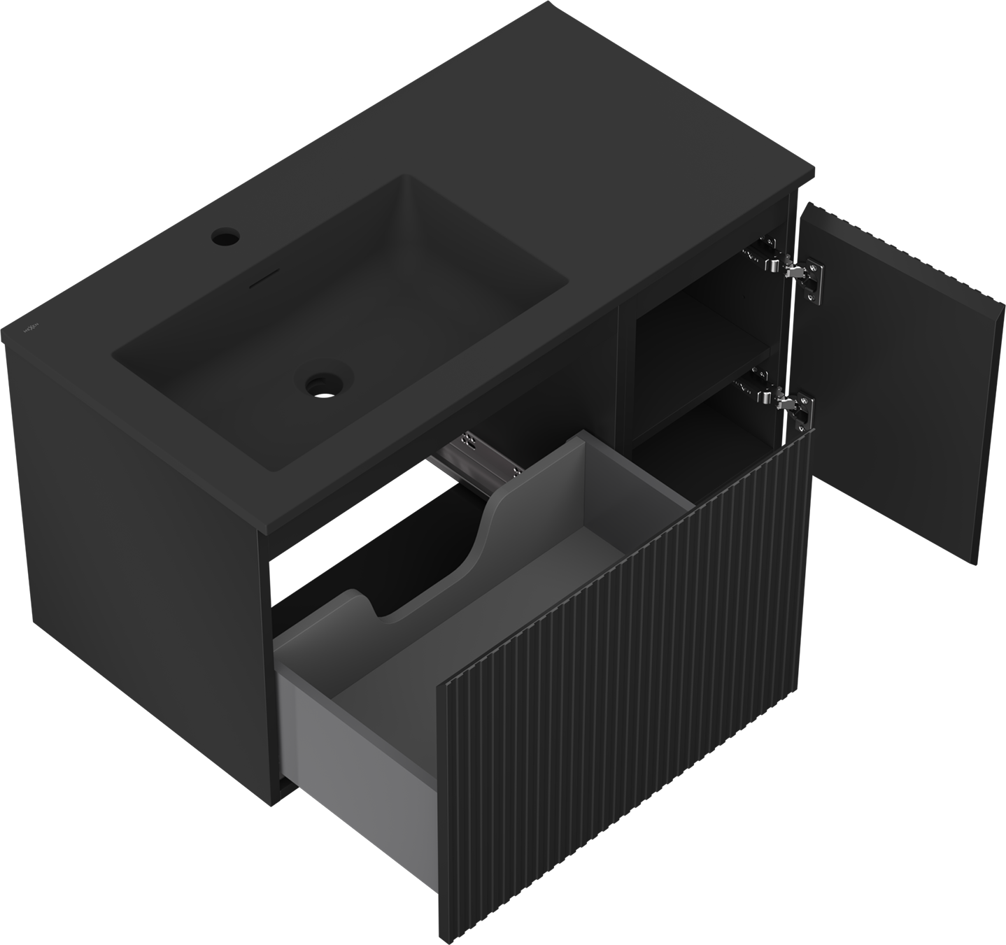 Mexen Rivel badkamerkast 90 cm met Otis wastafel links, 1 lade, 1 deur, gegroefd, zwart mat - 91A23-09047-3-BBFF71-W18L71