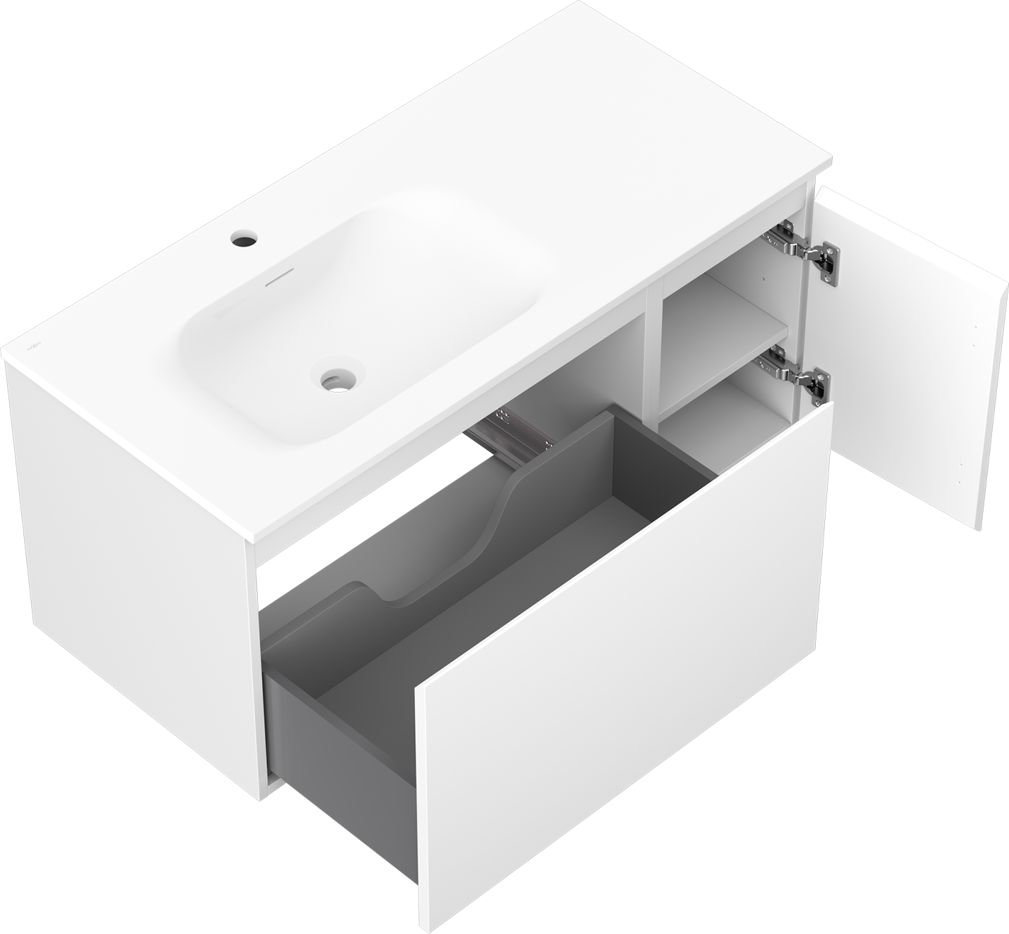 De uitsparing in de lade is zo ontworpen dat het de sifon kan bevatten, die noodzakelijk is in wastafelinstallaties. Hierdoor kan het meubel volledig functioneel worden gemonteerd, zonder dat er ruimte in de lade opgeofferd hoeft te worden voor installatiedoeleinden.