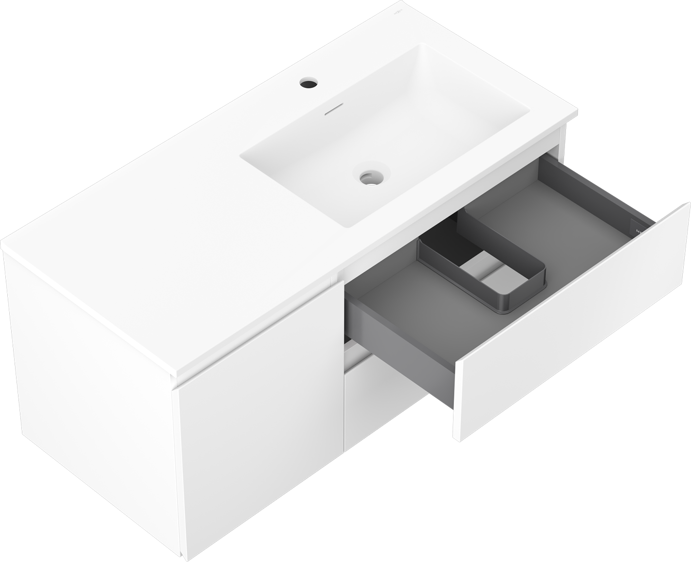 De uitsparing in de lade is zo ontworpen dat het de sifon kan bevatten, die noodzakelijk is in wastafelinstallaties. Hierdoor kan het meubel volledig functioneel worden gemonteerd, zonder dat er ruimte in de lade opgeofferd hoeft te worden voor installatiedoeleinden.