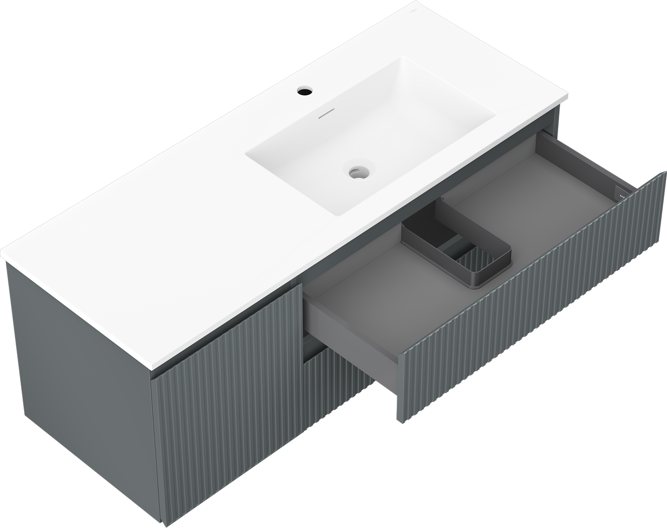 De uitsparing in de lade is zo ontworpen dat het de sifon kan bevatten, die noodzakelijk is in wastafelinstallaties. Hierdoor kan het meubel volledig functioneel worden gemonteerd, zonder dat er ruimte in de lade opgeofferd hoeft te worden voor installatiedoeleinden.