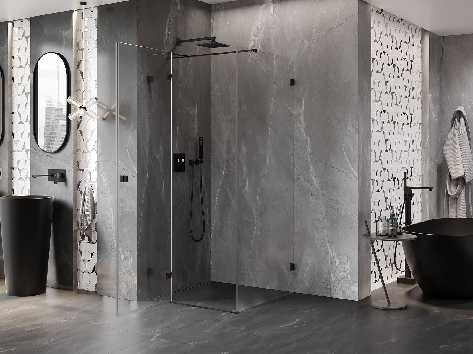 Handige en comfortabele greep is gemaakt van duurzaam en weerbestendig metaal. De modieuze vorm in combinatie met een afwerking die past bij de kleur van de profielen geeft het geheel een moderne en stijlvolle uitstraling, wat de esthetiek van elke badkamer benadrukt.