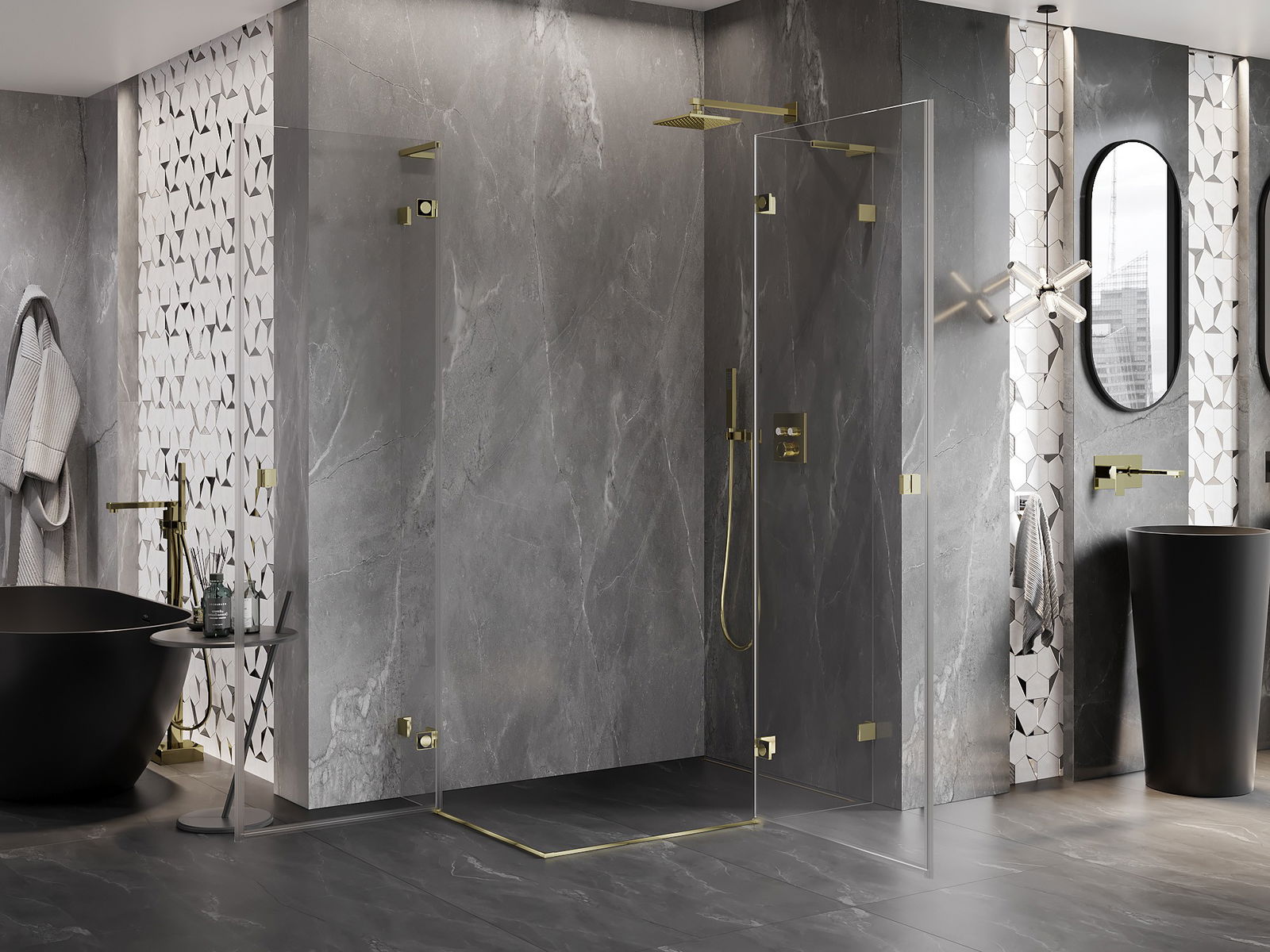 Messing handgrepen en scharnieren in lijn met het glasoppervlak
