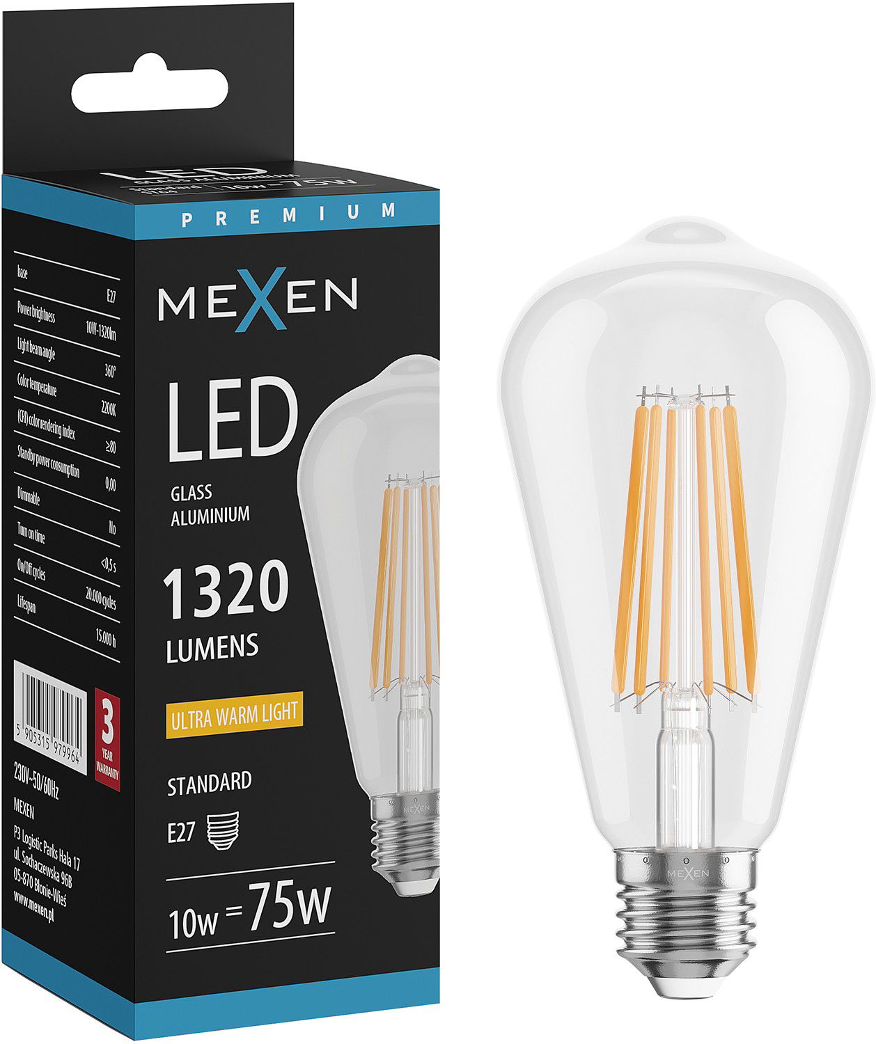 Mexen Vintis LED-filamentlamp E27, ST64, 10W, Warm - 2200K, 1320 lm, helder - L152-E27-1022-00