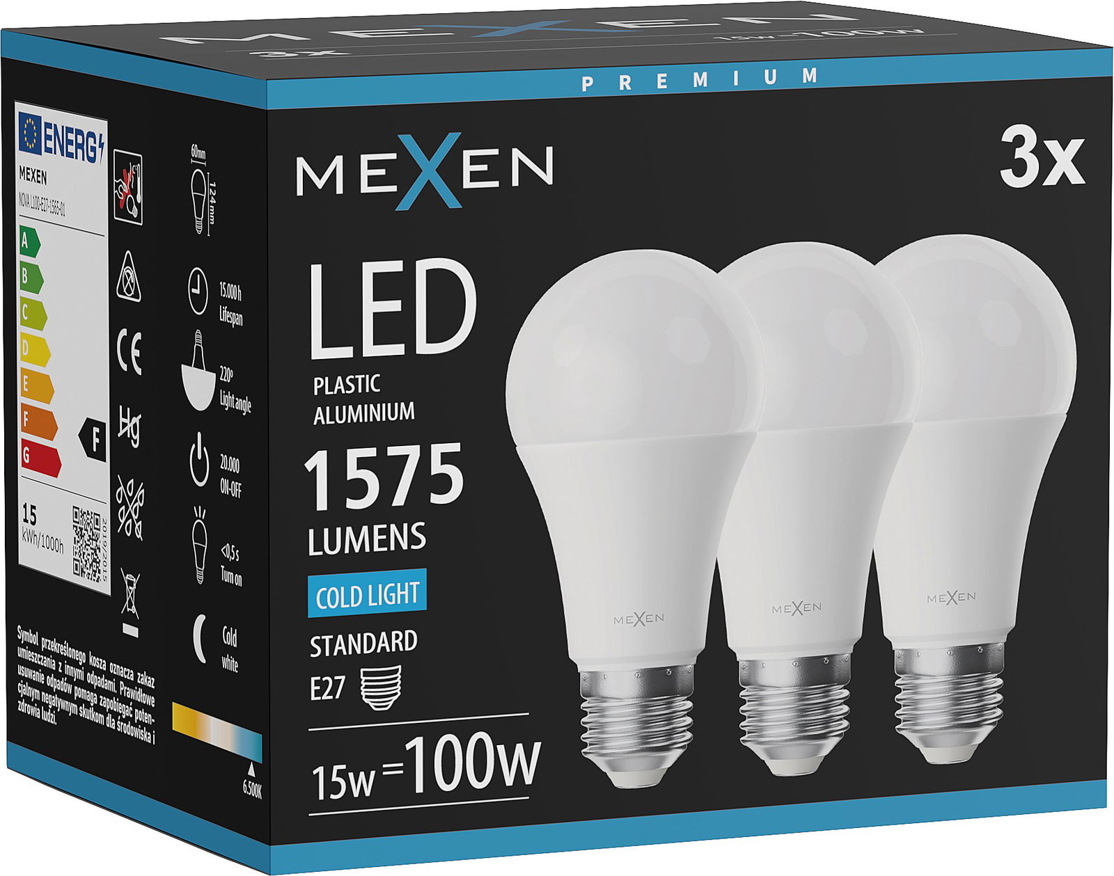 Mexen Nova 3x LED-lamp E27, A60, 15W, Koud - 6500K, 1575 lm - L100-E27-1565-01x03