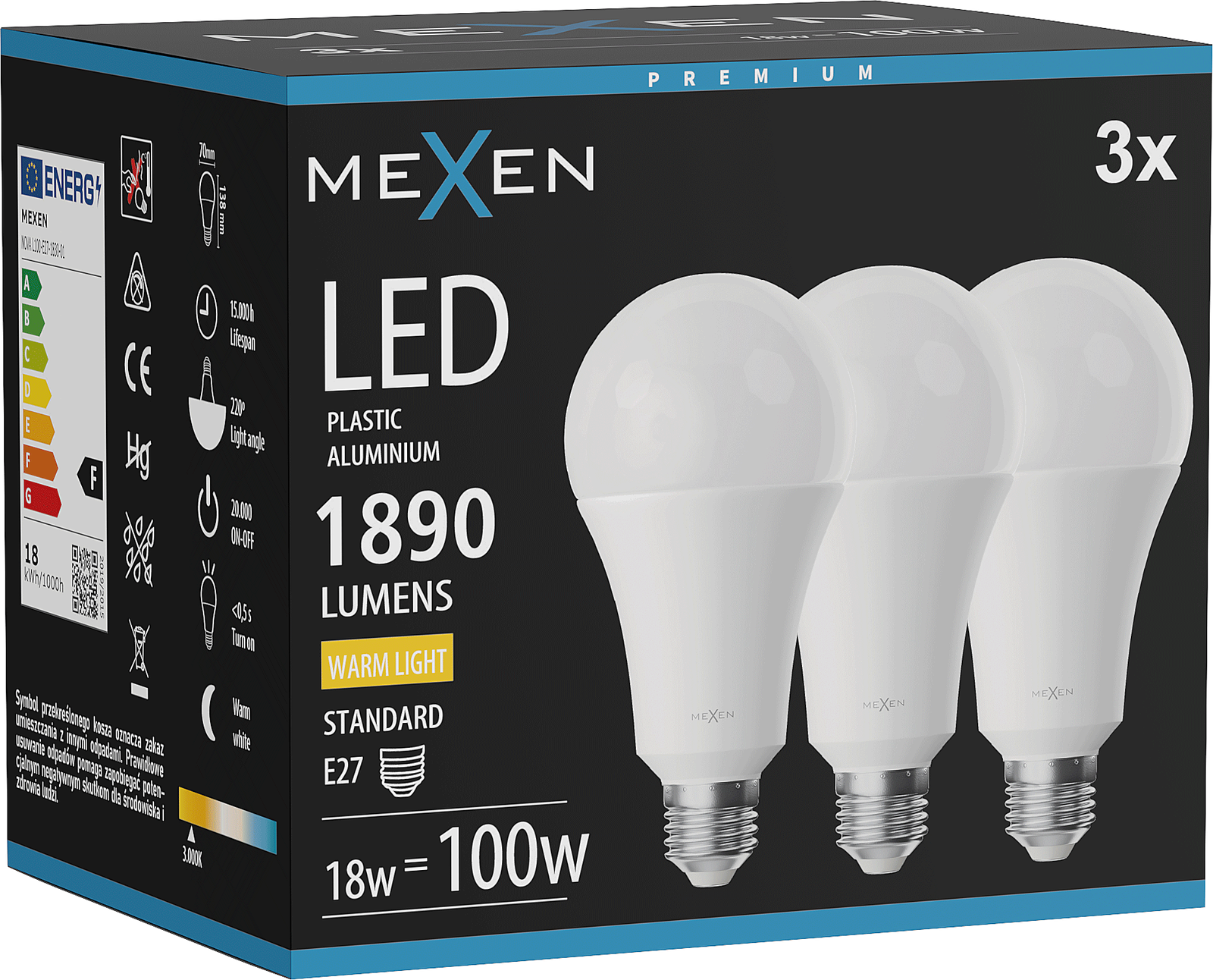 Mexen Nova 3x LED-lamp E27, A70, 18W, Warm - 3000K, 1890 lm - L100-E27-1830-01x03