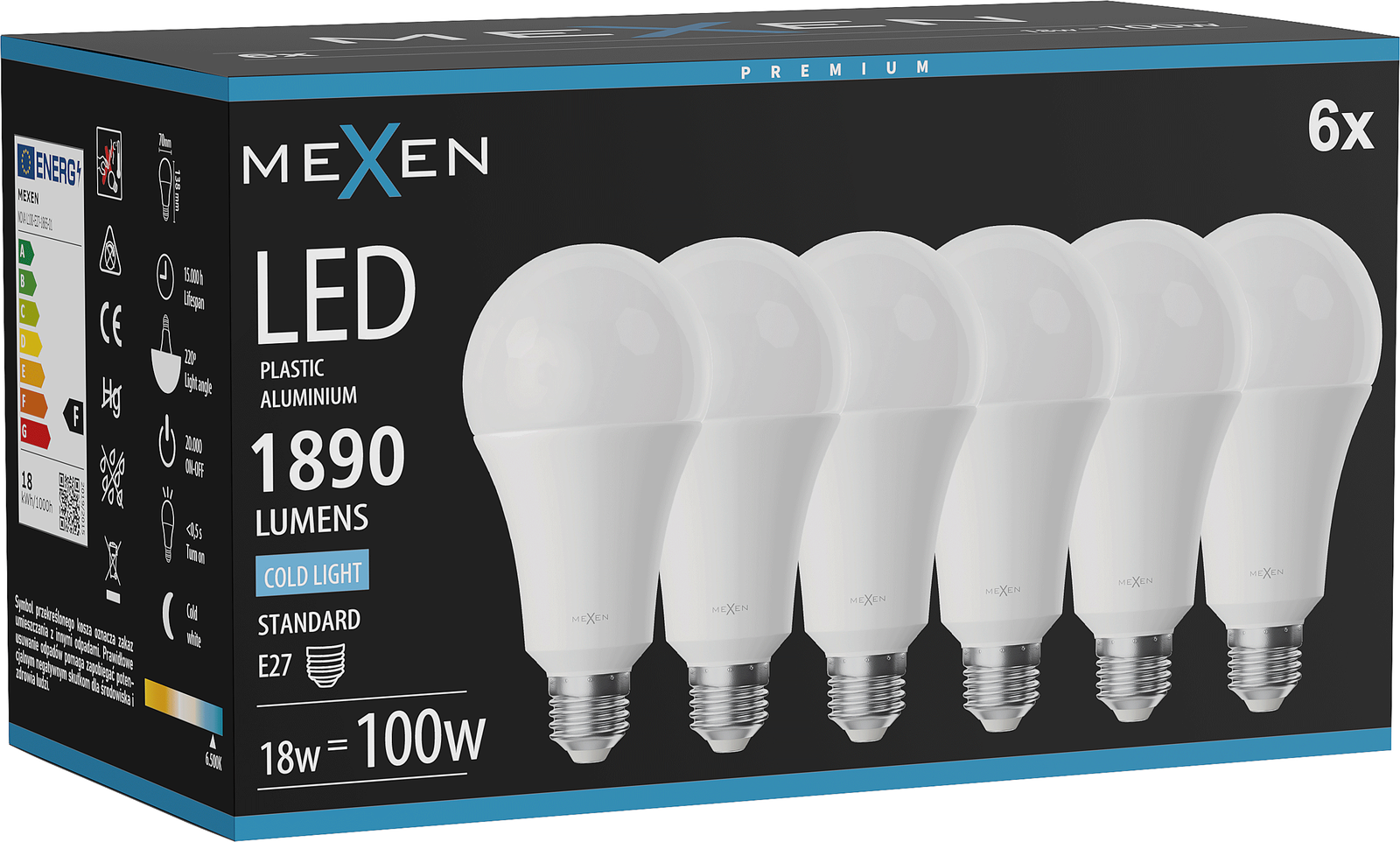 Mexen Nova 6x LED-Lamp E27, A70, 18W, Koud - 6500K, 1890 lm - L100-E27-1865-01x06