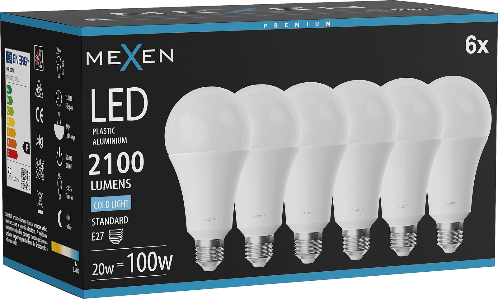 Mexen Nova 6x LED-lamp E27, A70, 20W, Koud - 6500K, 2100 lm - L100-E27-2065-01x06