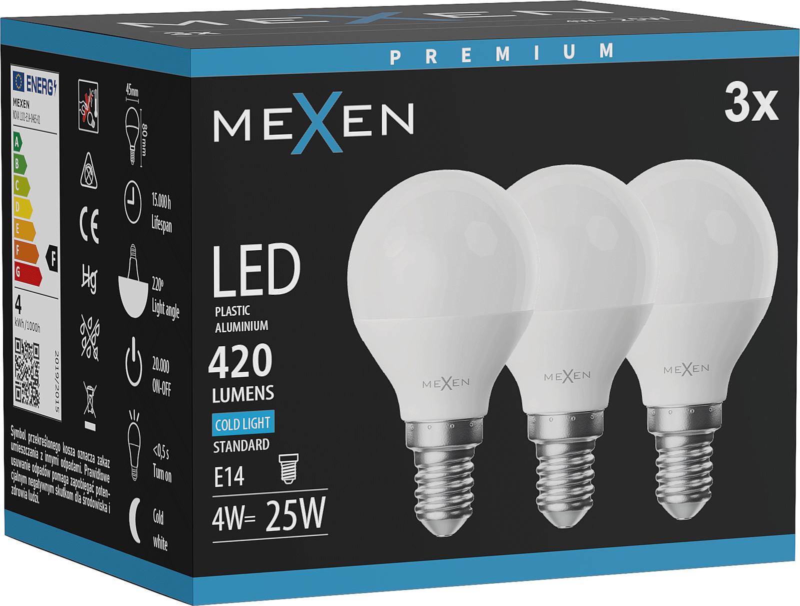 Mexen Nova 3x LED-lamp E14, G45, 4W, Koud - 6500K, 420 lm - L101-E14-0465-01x03